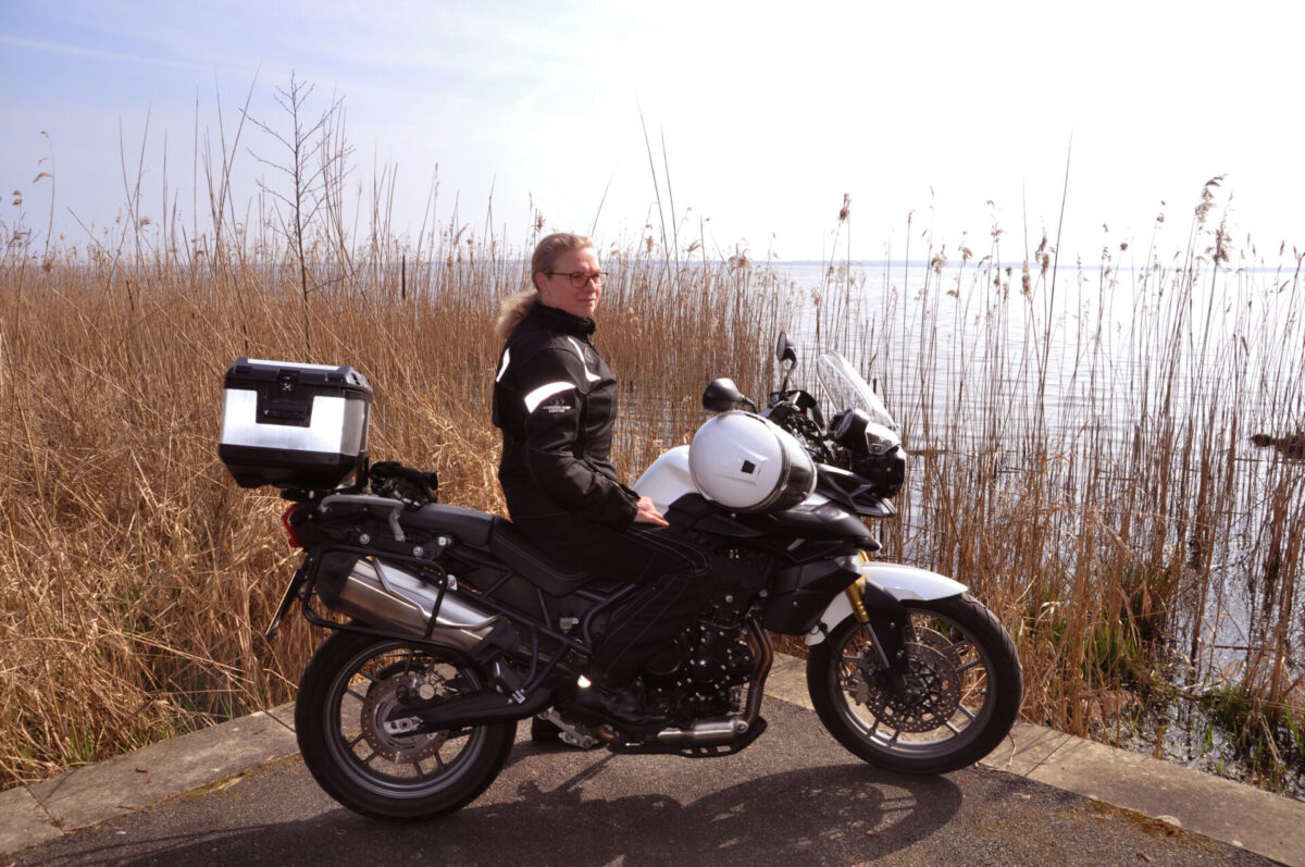 Eigentlich bin ich ja eine Warmduscherin“, lacht Birgit Feeß. Aber als bereits kurz vor Ostern schönes Wetter ist, zieht sich die Geschäftsführerin von Pro Hannover Region (PHR) auf Wunsch von Nobilis schon mal ihre Goretex-Kombi über und holt ihr liebgewonnenes schwarz-weißes Raubtier aus der Garage. Auf einer fast elf Jahre alten Triumph Tiger 800 geht es in der Frühlingssonne dann kurz auf eine erste Tour – für ein Gespräch über die Interessengruppe Motorrad der PHR. Ziel ist das nur wenige Kilometer entfernte Westufer des Steinhuder Meeres.