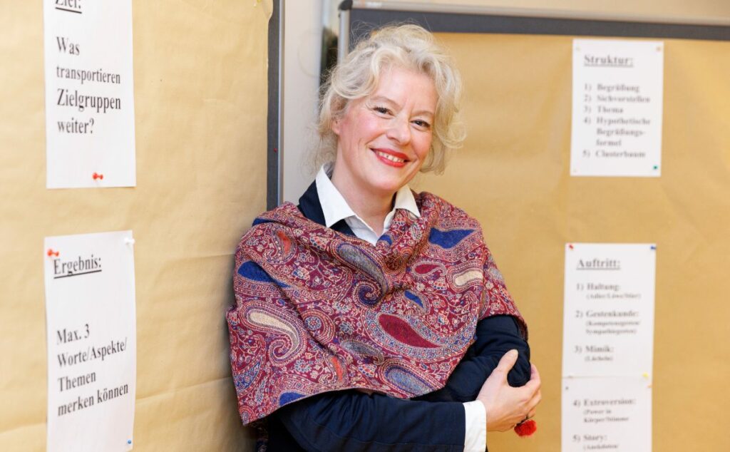 Wie ist sie denn zu ihrer Tätigkeit gekommen? „Als Teenager habe ich in mein Tagebuch geschrieben: Entweder werde ich Beraterin oder Tänzerin.“ Tatsächlich tummelte sie sich zunächst ausgiebig auf der Bühne: Kulturfreunde erinnern sich vielleicht noch an ihre Auftritte im Tanztheater-Ensemble von Katinka Zechner oder bei der freien Theatergruppe „Hebebühne“. Es erstaunt also nicht, wenn sie heute so überzeugend die eingangs geschilderte Urlaubszicke spielen kann.