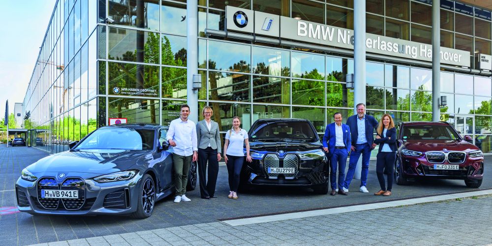 BMW Niederlassungsleiterin Nina Englert lädt Ansgar Heise, Tina Voß und Ingo Mahl zum Test der vollelektrischen BMW Flotte ein.