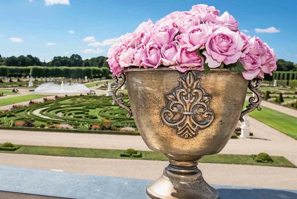 Viel Mühe, aber ein lohnenswerter Aufwand, denn: „Der Stadtpark ist ein Gartendenkmal von nationaler Bedeutung, weil alle anderen Gartenschauen dieser Zeit so nicht mehr erhalten sind“, sagt Ronald Clark, der Direktor der barocken Herrenhäuser Gärten. Auch unter seiner Regie gedeihen üppige Rosen. Mitten in Herrenhausens Großem Garten lädt der Niederdeutsche Rosengarten zum Flanieren ein, die Nachbildung eines der bereits im 16. Jahrhundert hoch geschätzten „Liebesgärten“, die Rosen als Inbegriff weltlicher Schönheit und als Blume der Venus feierten. Kieswege führen zwischen den Rosenbeeten hindurch. Die Mitte ist durch Hochstammrosen herausgehobenen, und an den Ecken des duftenden „Liebesterrains“ laden vier von Kletterrosen berankte Pavillons zum Verweilen und Träumen ein. Eine eigene Rosenkollektion repräsentiert die Gartenkunst der Herrenhäuser Gärten. Die drei edlen Rosen „Kurfürstin Sophie“, „King George I.“ und „Königin Marie“ erinnern an Hannovers royale Geschichte und sind Gartenkunst für jedermann, zu kaufen in praktischen Pflanzcontainern.