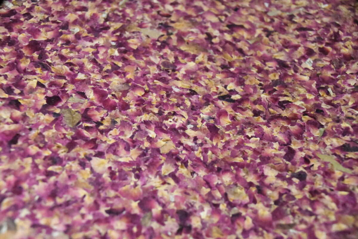 Vlieses mit gebrochenen Rosenblütenblättern, die zart nach der Königin der Blumen duften. Aus der Nähe lassen