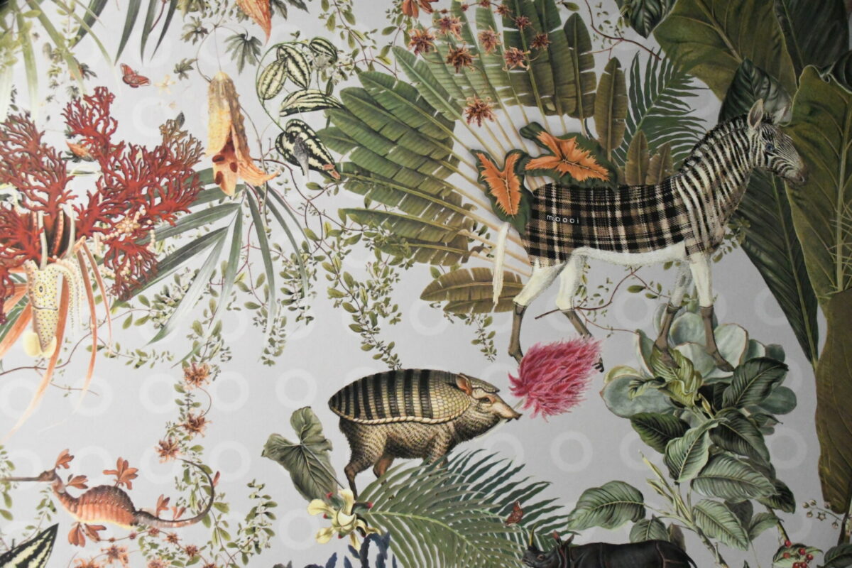 sich von der Kulturgeschichte inspirieren lassen. Kollektionen wie „Tokyo Blue“ arbeiten mit dunklem Blau und leuchtendem Rot. Andere Moooi-Dessins bilden urwaldähnliche Szenerien ab – man kann sich jederzeit auf Entdeckungsreise begeben und sich von Fantasieblumen und Fabeltieren ins Paradies entführen lassen.
