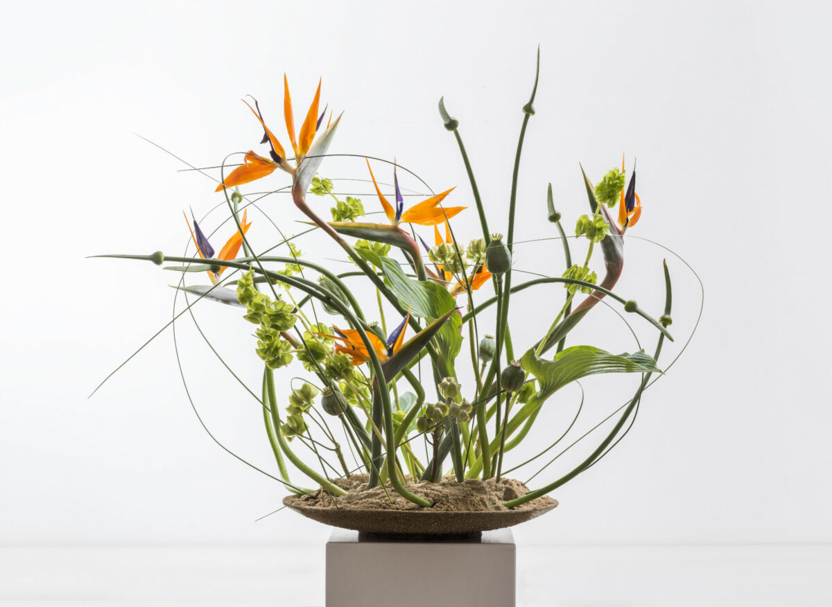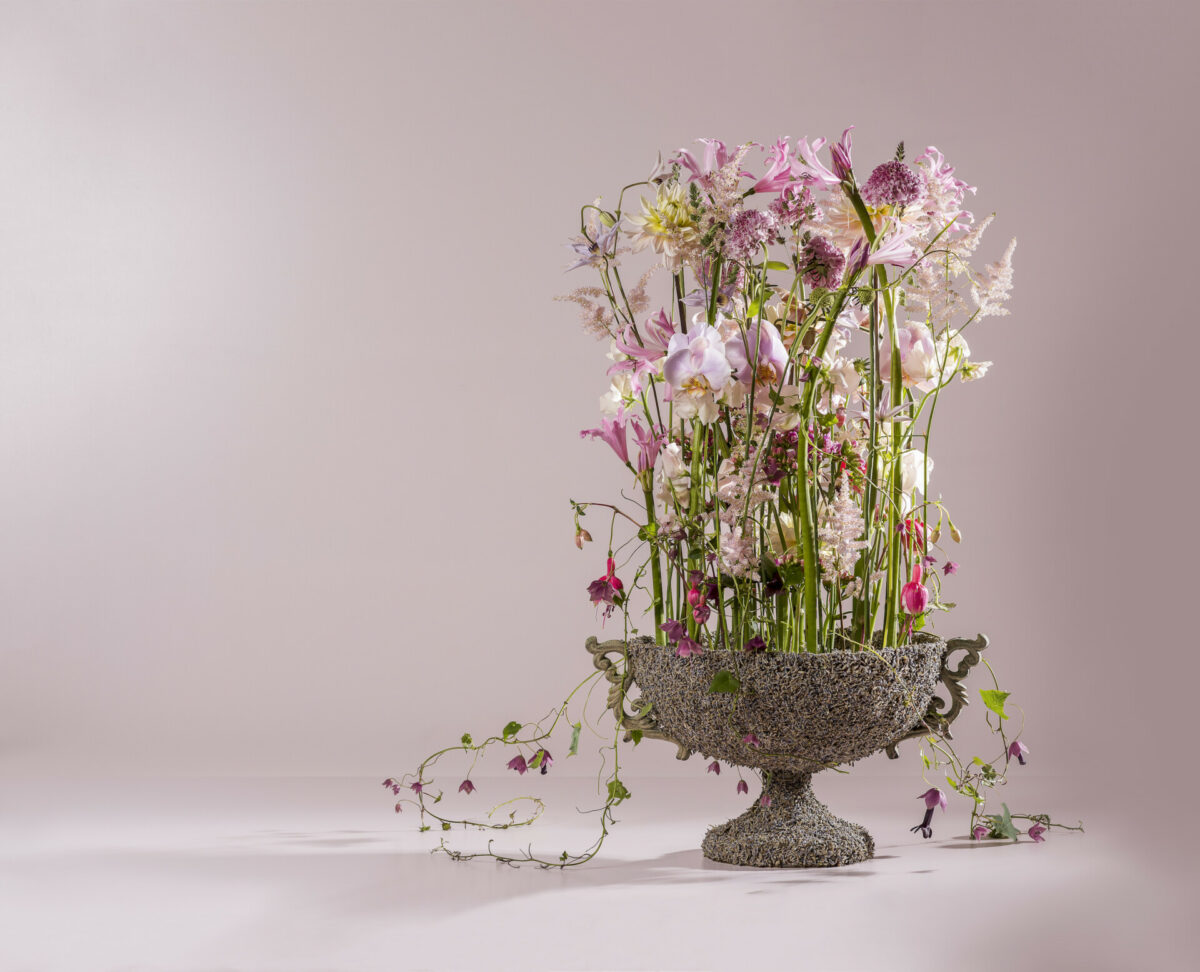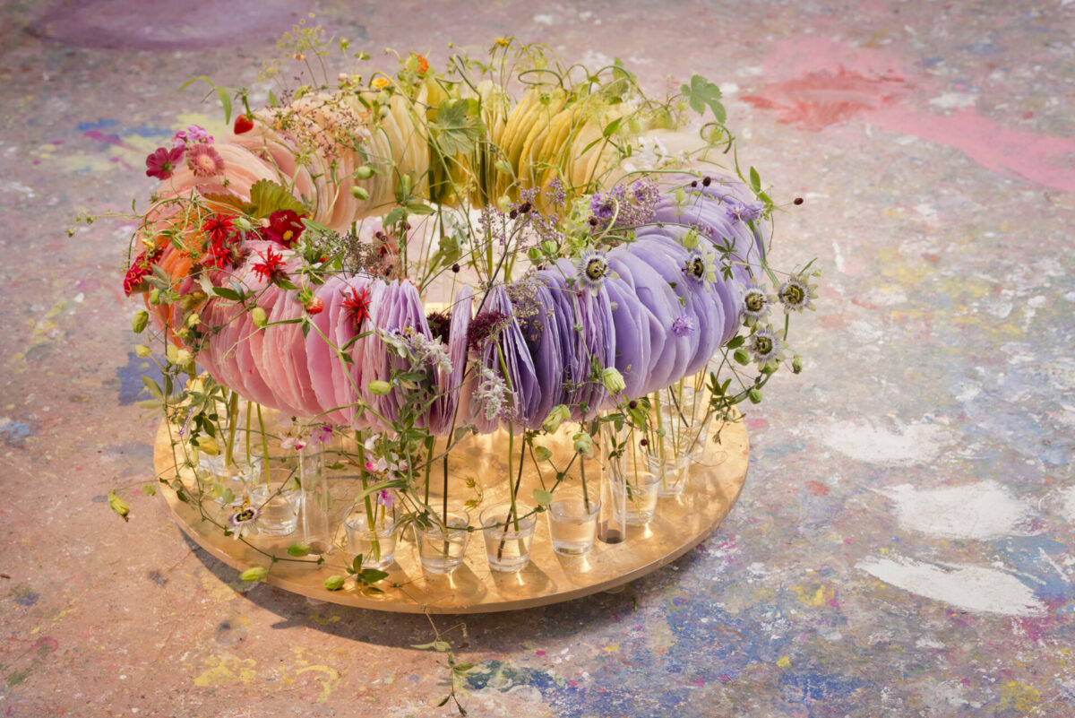 Wichtig für den gedeckten Tisch ist, dass alle Gäste miteinander kommunizieren können und kein Blumenschmuck dabei im Wege ist. Aber auch mit dieser Regel sind die Möglichkeiten für Blumen auf dem Tisch natürlich unendlich. Ob Gesteck oder Sträuße, man kann sie so klein und niedrig arbeiten, dass die Kommunikationsebene erhalten bleibt. Oder so hocharbeiten, dass dies auch der Fall ist. Ich liebe ja große, opulente Gestecke, die irgendwie von der Decke abgehangen werden. Das ist natürlich die „hohe Schule“ der floralen Tischdekoration und das kann nicht jeder so einfach zu Hause umsetzen, das ist mir natürlich klar. Wenn es aber gelingt, dann sieht das einfach sensationell aus.