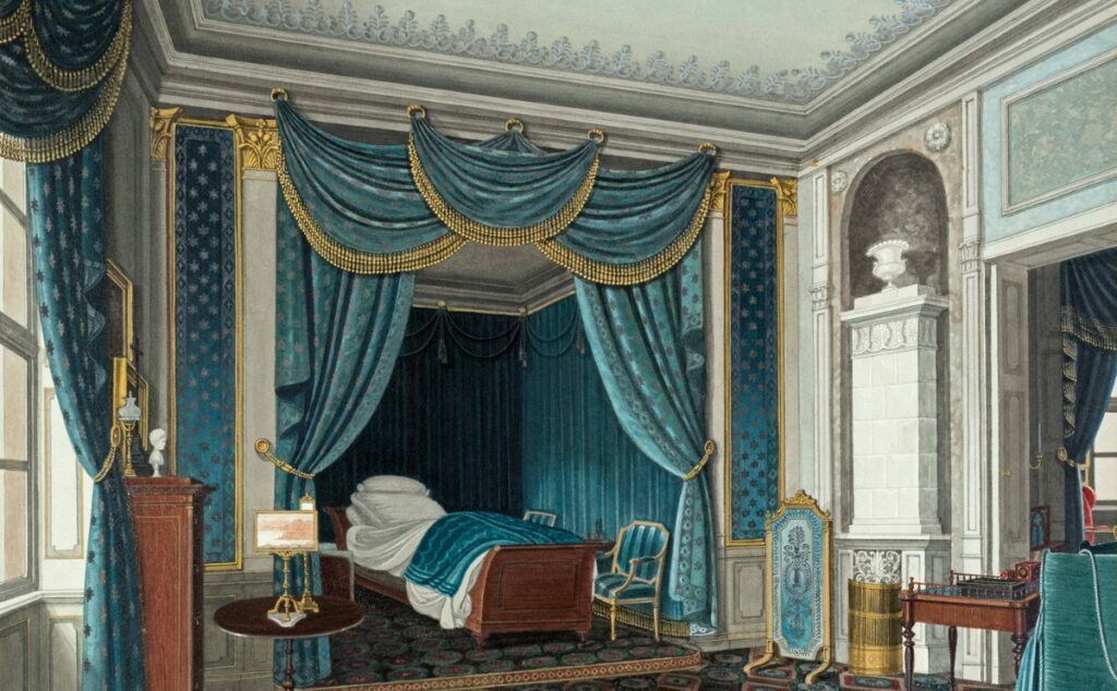 Besonders interessant wirkt gegen Ende des Rundgangs der Vergleich zweier Kastensofas, bei denen Laves Entwürfe von Pierre de La Mésangère zur Vorlage genommen hat: Das üppigere Exemplar mit seinen goldfarbenen Beschlägen war für ein höfisches Umfeld gedacht, die deutlich schlichtere Ausführung stand in Laves‘ eigenem Wohnhaus, der heutigen Architektenkammer am Friedrichswall.