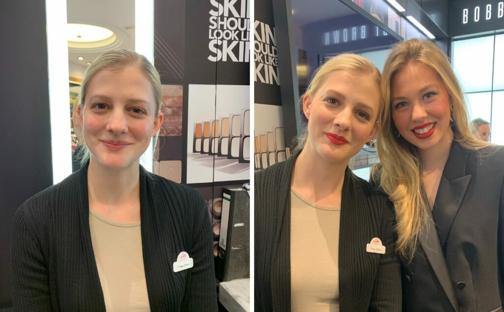 Bei der Foundation sollte der Ton stimmen. Am besten dazu die Farbe an der Stelle überprüfen, an der die Kinn- in die Halspartie übergeht. „Man kann auch an der Innenseite des Handgelenks schauen“, erklärt die Make-Up-Artistin. Wer sich dann noch unsicher sein sollte, kann auch die T-Zone – Stirn und Nase – für eine Probe nutzen. „Da wir den Glowy-Effekt des Primers nutzen wollen, verwende ich jetzt eine Foundation mit mittlerer Deckkraft“, sagt Stella-Victoria Wessels. Mit geübten Strichen trägt sie die Foundation auf und arbeitet dabei in kleinen Bewegungen von oben nach unten. „So, als würde man einen Tannenbaum malen“, erklärt sie. Eins sollte man auf alle Fälle vermeiden: „Bitte nie mit zusätzlich Foundation Pickel abdecken. Das sieht immer künstlich aus.“