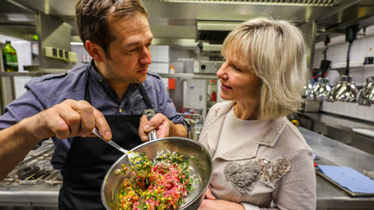 Die Kartoffeln sind schon in feine Streifen geschnitten. Das Öl in einem kleinen Stiltopf hat 180 Grad Celsius erreicht. Mit einem Handtuch trocknet Kettmann die Kartoffelstreifen nochmals ab, um diese dann in ein Sieb zu geben, das im Öl hängt. Es spritzt nicht. Es brodelt nur. Das ist ein sehr gutes Zeichen. Jetzt einfach die Kartoffelstreifen in Ruhe lassen. Zeit, um sich um das Tatar zu kümmern. Mit einem großen Messer schneidet Benjamin Kettmann das Fleisch in Stücke. Was bei ihm sehr einfach aussieht, könnte andere (Hobby-)Köche vor Herausforderungen stellen. Das Fleisch sollte nicht zu grob, aber auch nicht zu fein sein. „Wer sich unsicher ist, der sollte beim Fleischer seines Vertrauens frisch gewolftes Kalbfleisch bestellen“, rät der Küchenchef, während er das Fleisch routiniert mit dem Messer bearbeitet. Wenn es klein genug ist, wird es mit den fein geschnittenen Zutaten vermengt. Die Schalottenwürfelchen, Kapern und Sardelle kommen hinein und etwas Petersilie dazu. Anschließend mit Pfeffer abschmecken. „Bitte erst kurz vor dem Servieren salzen“, betont Kettmann. Sonst würde das Fleisch Wasser ziehen und man müsste das wieder abziehen und das ganze Gericht sehe nicht schön aus.