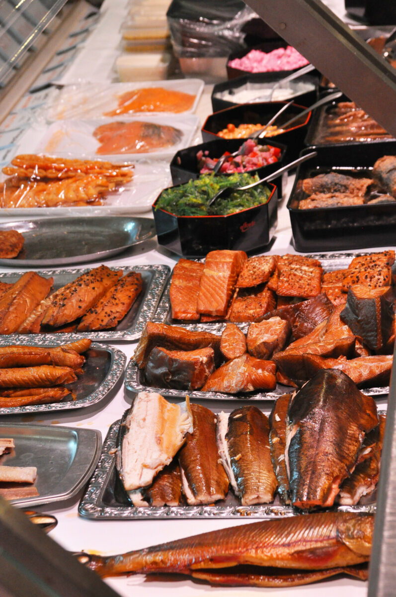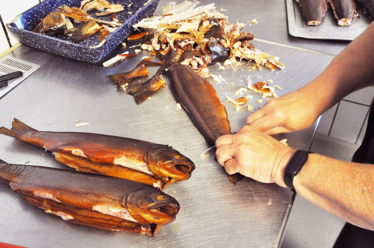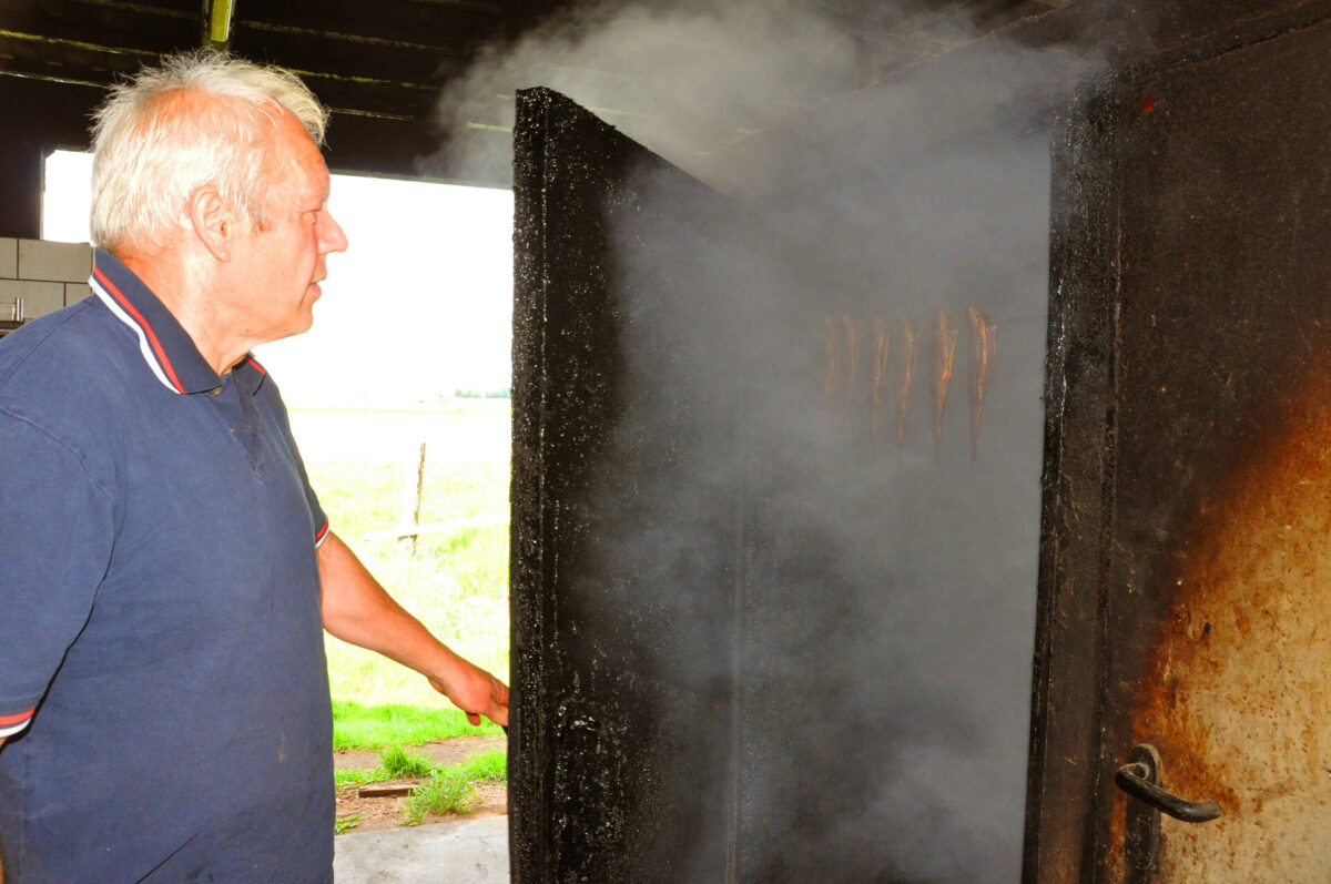 „Seit 1972 betreiben wir jetzt Fischzucht und räuchern selbst“, erzählt Hartmut Pflüger. 1983 hat er als frisch ausgebildeter Fischwirt den Familienbetrieb von seinem Vater übernommen. Und veredelt inzwischen bis zu 17 Fischsorten täglich im traditionellen Heiß- oder Kaltrauchverfahren zu ausgewählten Fischspezialitäten. „Wir nehmen Erlenholz dafür, dazu kommen Buchenspäne“ beschreibt der emsige Teichwirt die würzigen Zugaben. Forellen bleiben bei 80 Grad so zwei Stunden im Rauch. Bei salzgegarten Fischen, wie Lachs, dauert das Räuchern bei nur 25 Grad insgesamt sogar eineinhalb Tage.
