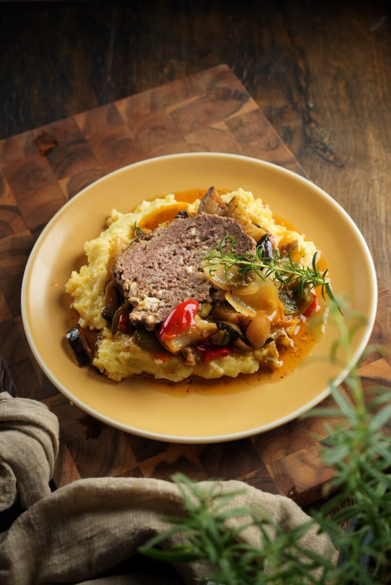 Rezept: Mediterraner Hackbraten mit geröstetem Gemüse und Kartoffelstampf