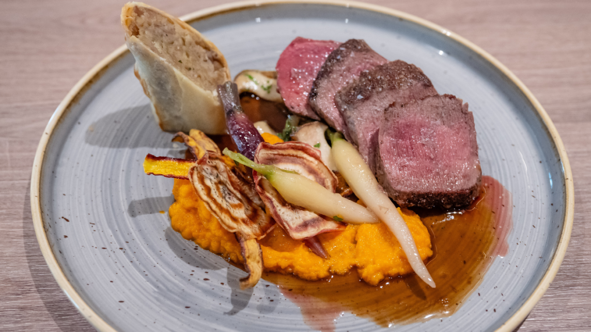 Der Rehrücken in der zweiten Pfanne wird langsam kross. Jetzt kommen zwei Rosmarinzweige hinzu. Schmelzer drückt mit dem Daumen aufs Fleisch. An der Konsistenz merkt er, wann es rosa ist. „Wenn es gar nicht mehr nachgibt, ist es definitiv zu spät – und keineswegs mehr rosa.“ Das Fleisch scheint perfekt zu sein. Es kommt vom Ofen und zum Ausruhen unter eine Wärmelampe. „Das ist nötig, damit sich der Fleischsaft gut verteilt.“ Die Kräuterseitlinge bekommen noch ein wenig Petersilie.