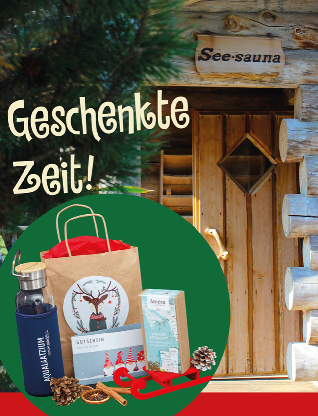 in Deiner Saunazeit. Die Wärme tut gut und wärmt jeden Muskel, nimm Dir die Zeit, innezuhalten und einen tief erfüllten Zustand der Entspannung zu erleben. Geschenkte  Zeit – jetzt als Weihnachtstüte inklusive Wertgutschein oder im Onlineshop.