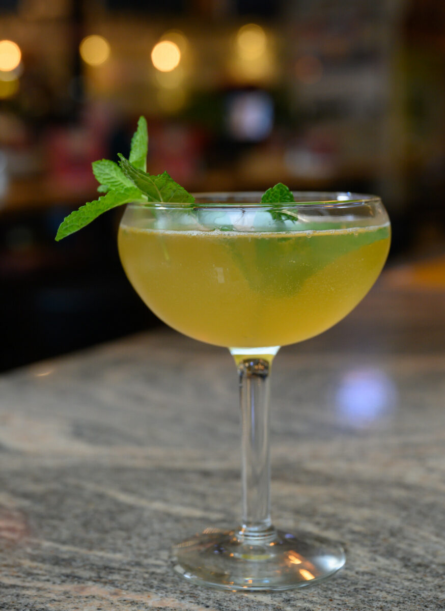 Alle Zutaten außer Minze und Champagner in einen Shaker geben und