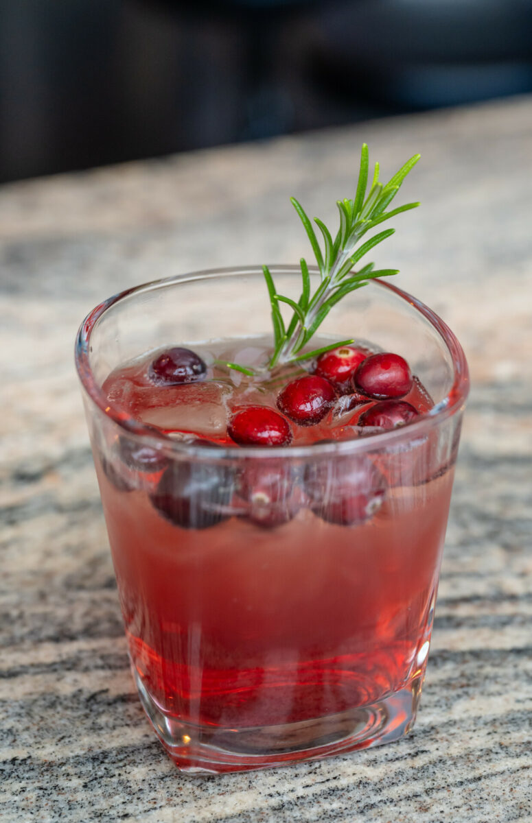 Als Dekoration reichlich Cranberrys und einen Zweig Rosmarin ins Glas