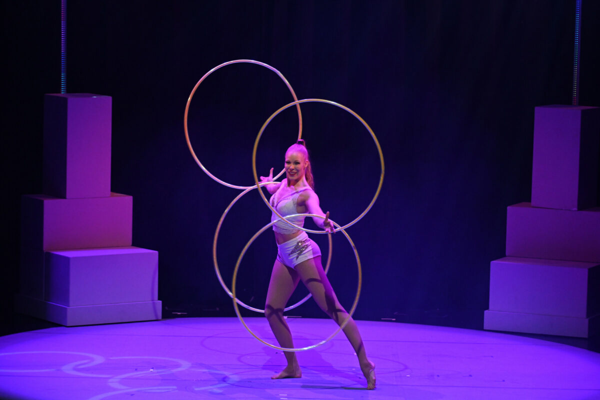 Gleich mehrere Reifen hat Annika Hakala dabei. Die in Österreich lebende Finnin lässt die Hula-Hoop-Reifen aber nicht nur um ihren Körper kreisen. Sie malt mit ihnen glänzende grafische Bilder in den dunklen Bühnenraum.