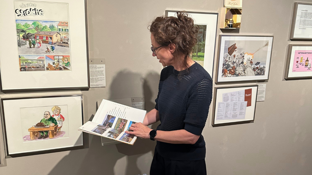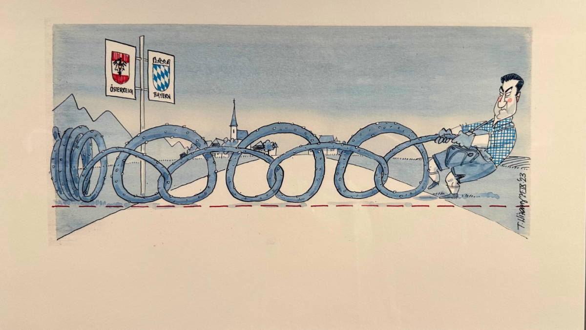 Und so trägt diese Ausstellung ein klein wenig zur Völkerverständigung bei – auch wenn es auf beiden Seiten bissig hergeht. Da gibt es beispielsweise auch ein Spezialthema in der Ausstellung, das sich einzig und allein dem Verhältnis zum südlichsten Bundesland der Bundesrepublik widmet: Bayern. Da zieht ein Markus Söder nicht unähnlicher Mann eine Brezlgrenz zwischen Bayern und Österreich. Thomas Wizan hat sie 2023 gezeichnet.