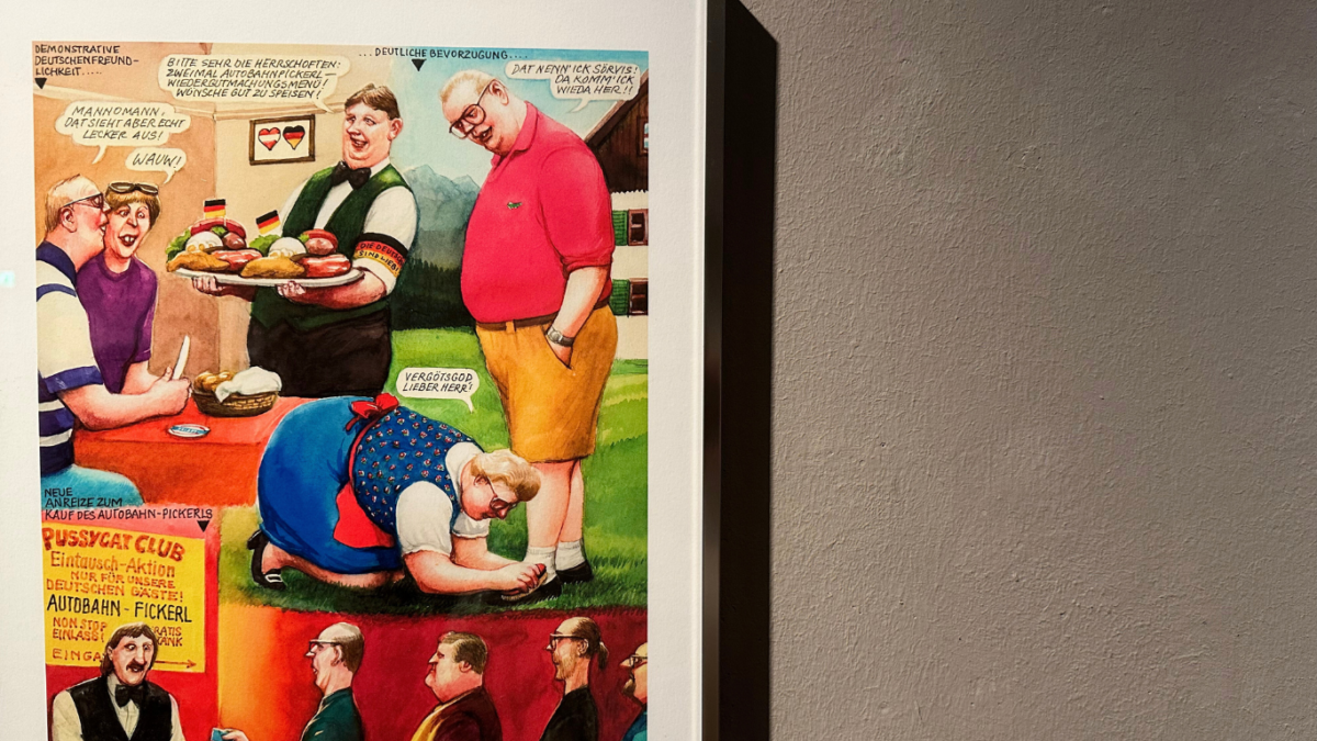 Auch als damals die Autobahnvignette eingeführt wurde und die Angst der Österreicher groß war, dass die Deutschen deswegen nicht mehr in den Urlaub ins Nachbarland fahren würden, ist ein Thema. Gerhard Haderer hat seine eigenen Lösungsvorschläge zu Papier gebracht, die Deutschen wieder ins Land zu bekommen. Er hat daraus eine Art Comic gemacht. Wie wäre es damit, den Deutschen die Schuhe zu putzen oder Eintrittskarten in den Pussyclub zu schenken?