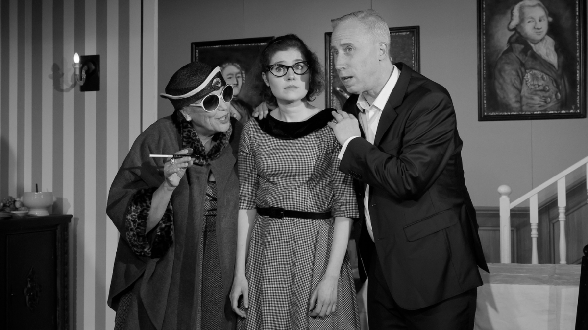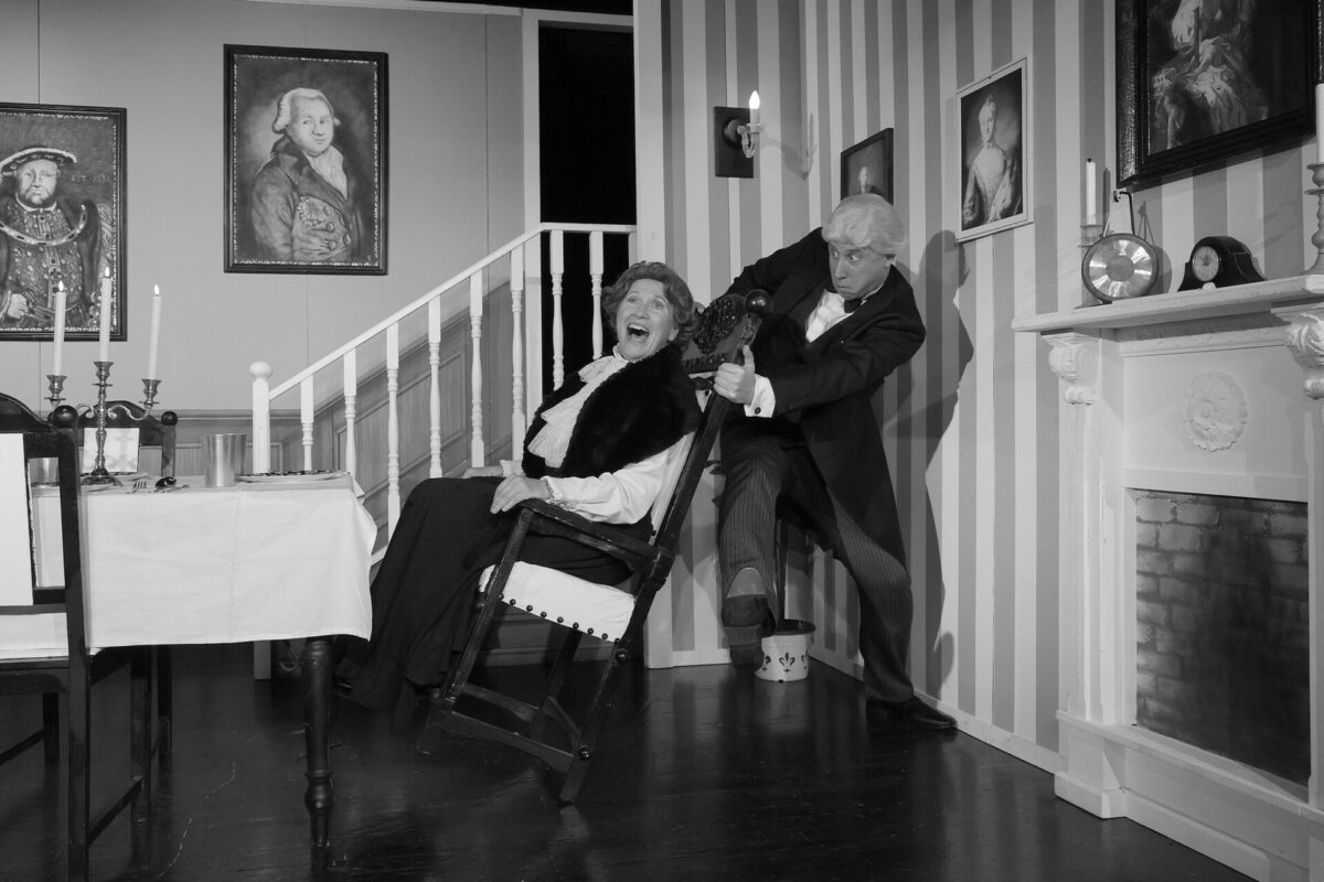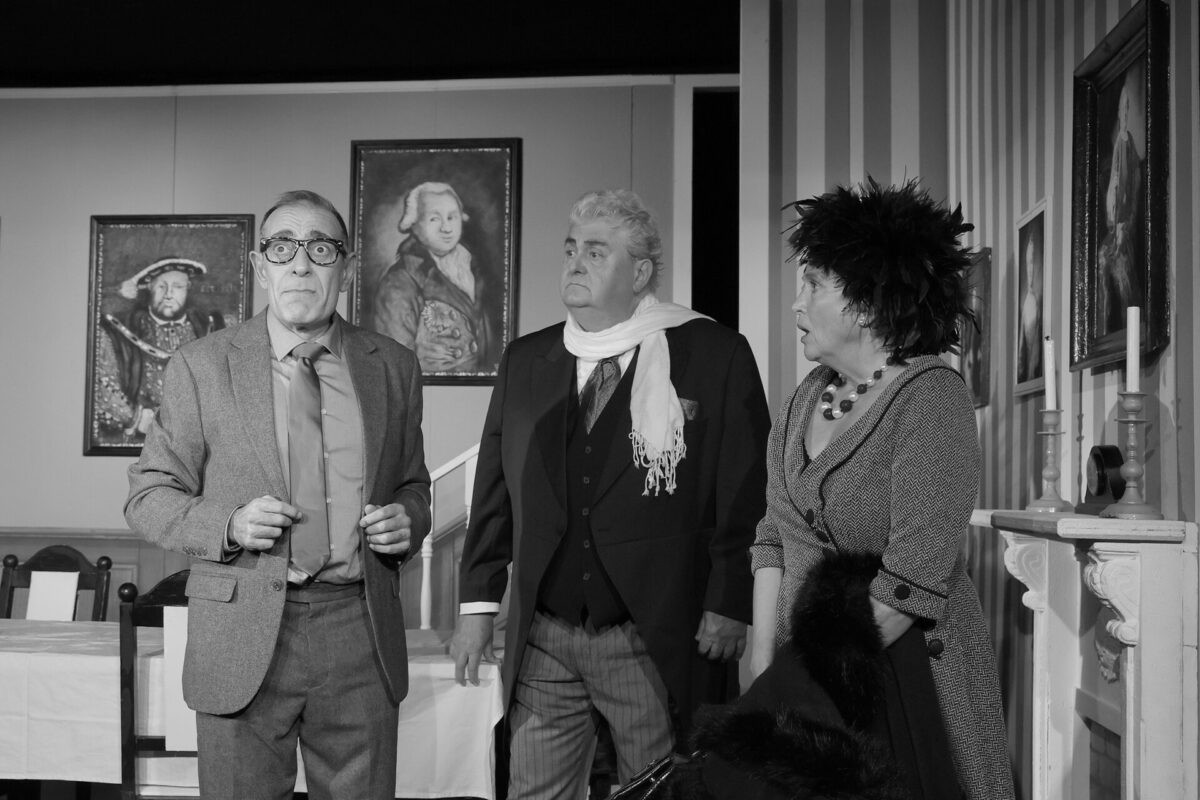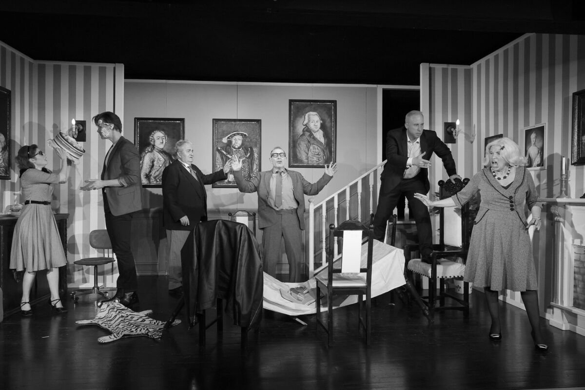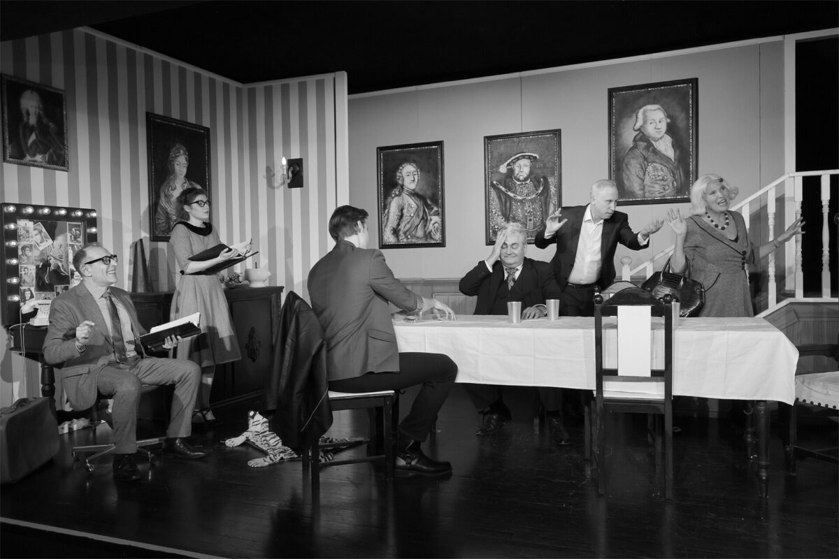 Die Kulisse ist bekannt. Die Treppe, die Tafel, der Kamin, das Tigerfell, über das James später stolpern wird. Alles ist so, wie man es aus dem Film kennt. Ja, sogar die Farbigkeit haben Horst Neumann und Gunter Battermann ins Bühnenbild aufgenommen: Es ist komplett in Schwarz-Weiß. Ein paar Grau- und Beigetöne sind auch dabei, aber es ist alles wie im Film. Sogar die Schauspieler hat Christian Hofmann (Kostüme) in Schwarz-Weiß eingekleidet. Das ist ungewöhnlich, aber gut. Außergewöhnlich groß ist dieses Mal auch die Besetzung, die auf einer der kleinsten Bühne der Stadt spielt. Normalerweise sind es drei Schauspieler, die ein Stück geben, bei der „Wahrheit über Dinner for One“ sind es sechs.