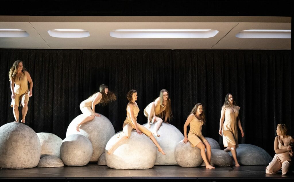 Tatjana Gürbaca hat einen feinen Blick auf die alte Geschichte, in der ein Wasserwesen aus Liebe zu einem Menschen werden möchte. Rusalka träumt davon auf dem Grunde ihres Meeres, der überzogen ist von großformatigen, kugeligen Gebilden. Sie werden in jeder Szene zu sehen sein – mal als Kiesel des Meeresgrundes, auf denen die Nixen herumtollen, mal in Miniaturversion in einer Vitrine als Erinnerung an die Heimat, mal als Monde im Weltall (Bühne: Klaus Grünberg). Zu Beginn tollen die Nixen zwischen ihnen herum. Sie rutschen von ihnen herunter, schmiegen sich an sie. Das Meer ist für sie ein Spielplatz. Umso weniger können sie Rusalka verstehen, die diesen Ort verlassen möchte.