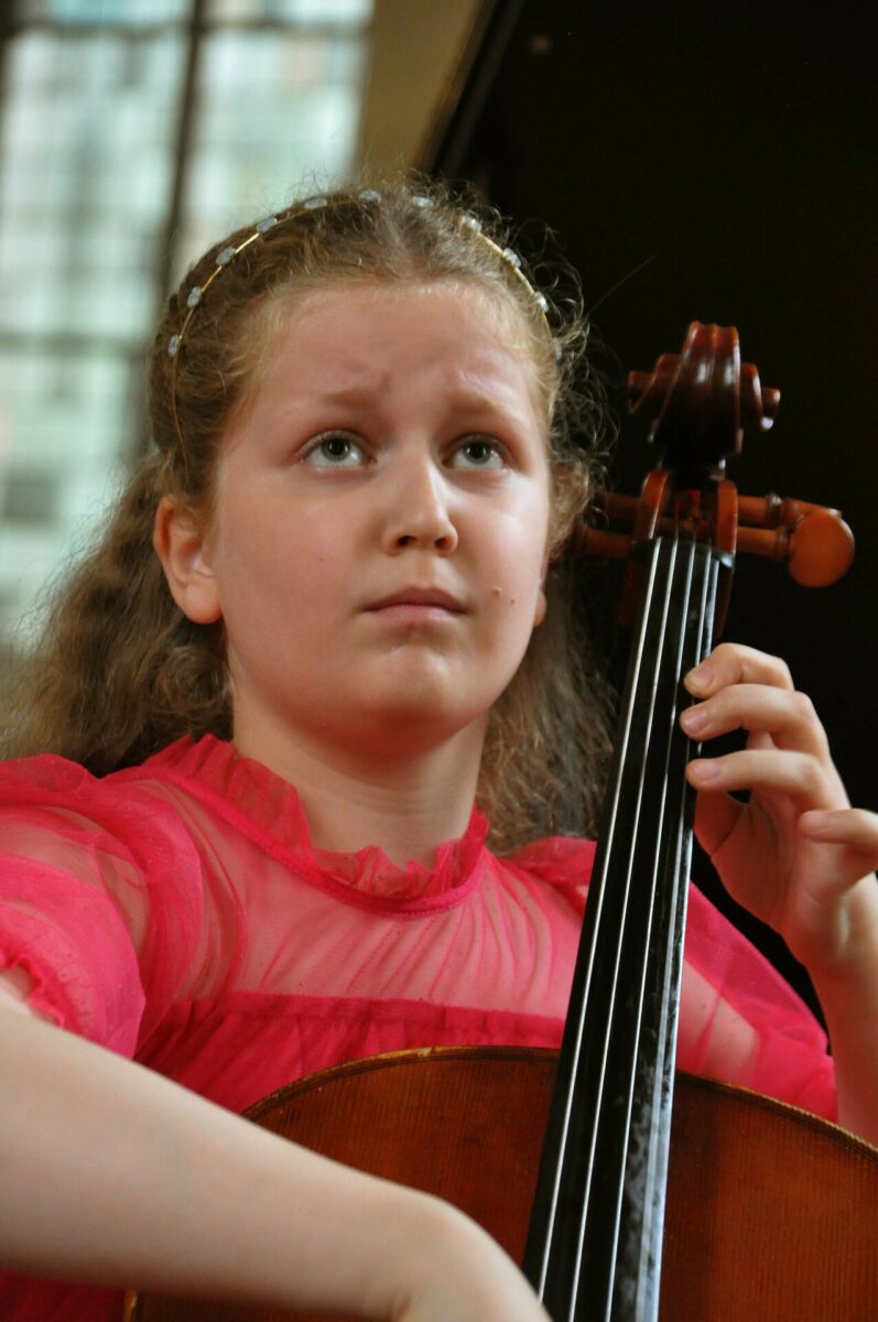 Noch einmal für den stimmigen Klang mit dem Bogen über die Saite des Violoncellos streifen. Nachjustieren am Feinstimmer. Erneutes Ziehen des Bogens über die vier Saiten. Wieder dreht die elfjährige Charlotte Melkonian nach dem Lauschen gezielt an den kleinen Schrauben ihres Instruments. Nur, um nach einem kurzen Trockenwischen des Bogengriffes und einem Moment der Konzentration die Zuhörer in der vollbesetzten Kreuzkirche dann mit dem Spiel auf ihrem Violoncello musikalisch in den Bann zu ziehen.