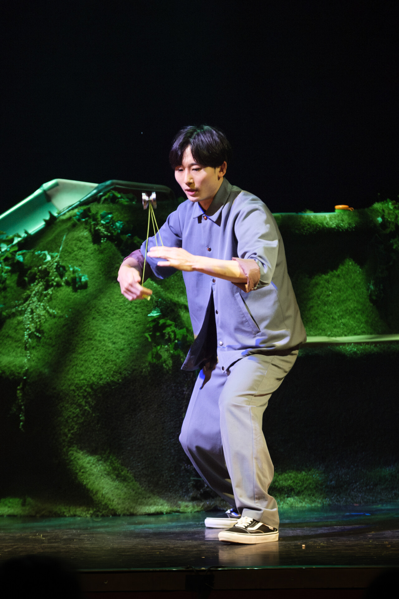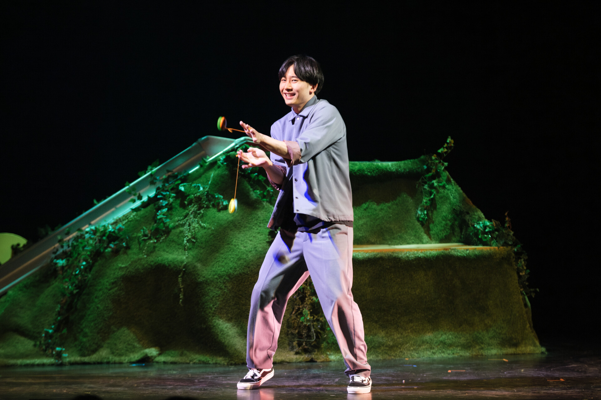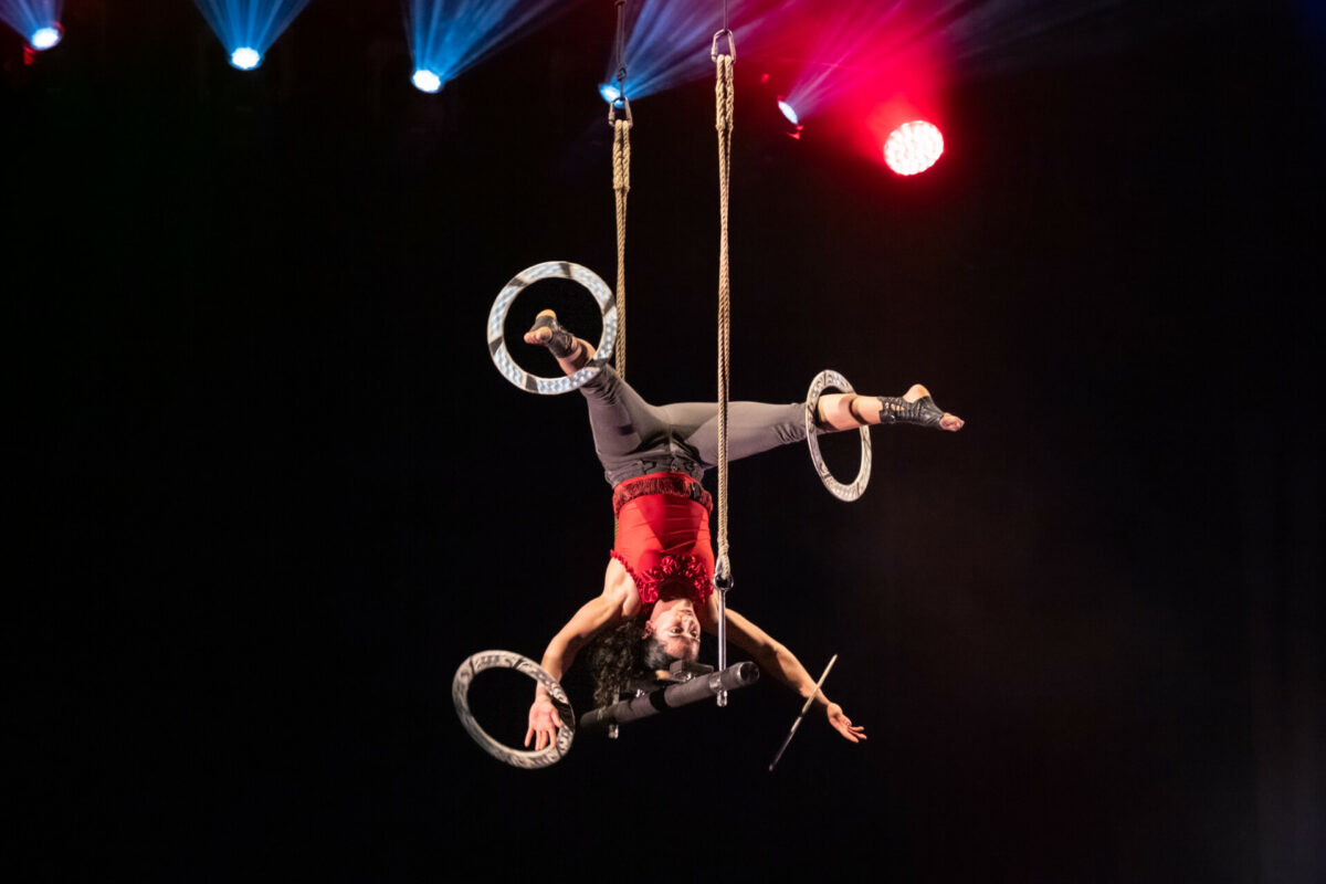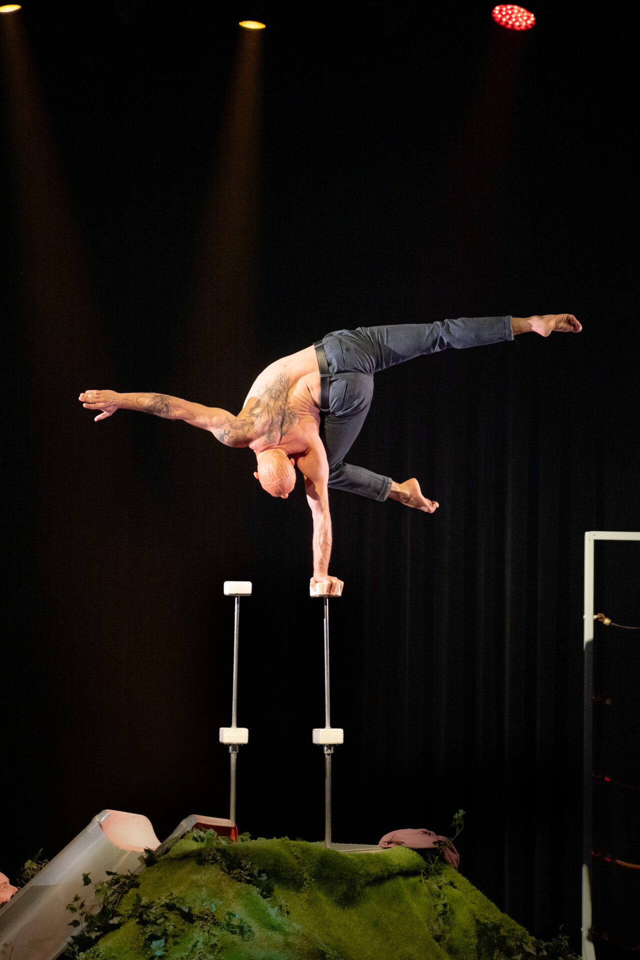 Was wäre eine Spielplatz-Truppe ohne einen begnadeten Jojo-Spieler, der mit dem kleinen Spielzeug die ganze Gang zu begeistern weiß? Shu Takada lässt die Jojos aber nicht nur rotieren, er selbst bindet sich mit großartigen Moves in die Nummer ein. Zwei, die sich umeinanderdrehen, sind Daniel Monni und Marina Sabetta. Für ihre rasante Rollschuhnummer benötigen sie kleinsten Raum. Doch den nutzen sie, um ordentlich Schwung zu holen. So können sie die Fliehkräfte nutzen, um spektakuläre Bilder zu gestalten. Das zweite Pärchen auf dem Platz sind Marie-France Huet und Francis-Olivier Girard vom Duo M.G.. In ihrer Handstand-Partnerakrobatik vereinen sie Kraft mit Stil und Spiel.