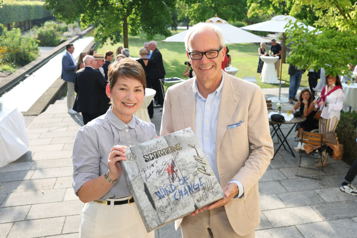 Den hatten auch Unternehmerin Jasmin Arbabian-Vogel und Wolfgang Sick. Sie hatten zuvor für die Auktion eine exklusive Scorpions-Box gespendet, die neben der CD auch ein Stück Mauer enthielt. Nach Hause gingen sie mit ein paar Cowboystiefeln, die der Künstler Sven Liesy bemalt hatte. Ulli Hahn hatte eigens eine Jacke verschönern lassen, die ebenfalls unter den Hammer kam – und die am Abend übrigens gleich von dem glücklichen Neu-Besitzer getragen wurde.