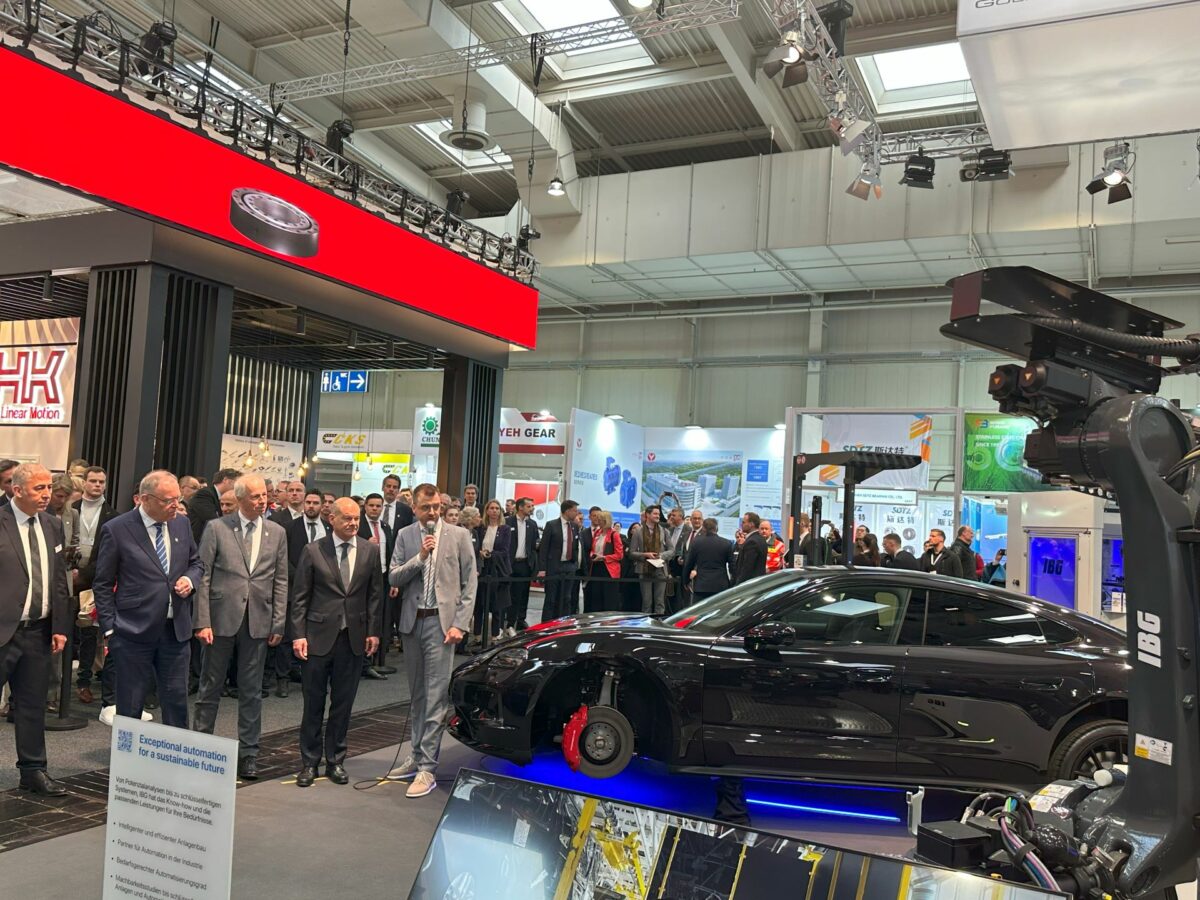 Und so startete der Rundgang über die Messe auch beim Stand des Partnerlandes Kanada, wo der Bundeskanzler wie bei einem Eishockeyspiel einen Puck fallen ließ und damit den Stand eröffnete. In Halle fünf besuchte er das Unternehmen Flender, machte einen Abstecher zu Schaeffler, schaute sich bei IBG Automation einen automatisierten Reifenwechsel an und spielte in Halle sieben bei den Kanadiern gegen einen Robo Goalie – einen Roboter-Eishockeytorhüter. Ein Tor konnte Scholz leider nicht schießen. Dafür war der Torhüter zu schnell.