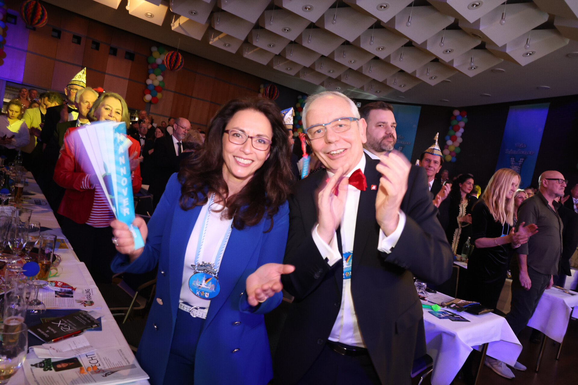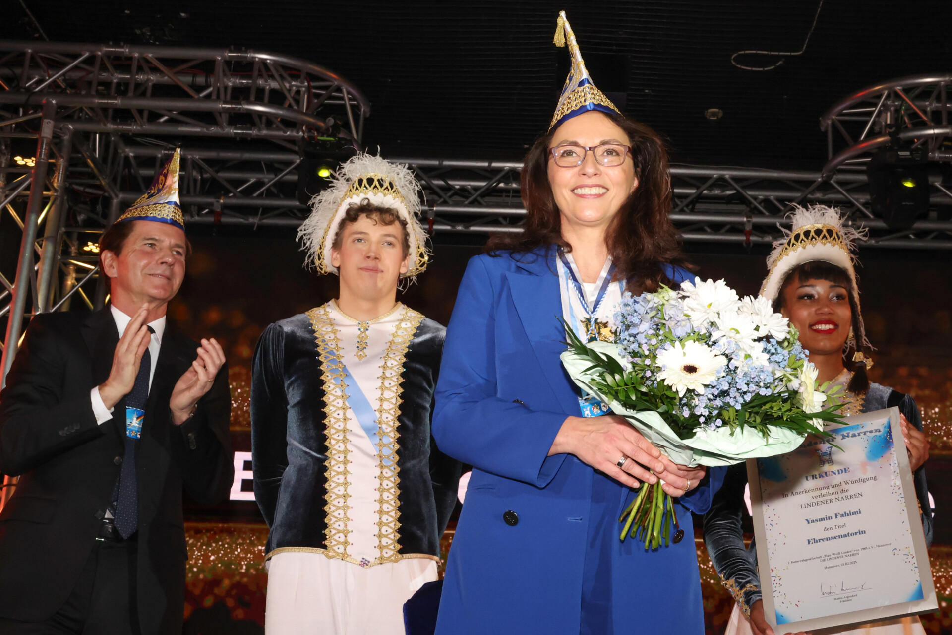 Über eine besondere Ehrung konnte sich auch die DGB-Vorsitzende Yasmin Fahimi freuen, die in den Farben der Lindener Narren kam: Blau-Weiß. Sie erhielt die Ehrensenator-Würde, die als höchste Auszeichnung im Karneval gilt. Die Laudatio hielt der ehemalige Regierungssprecher der Bundesregierung, Béla Anda. Er betonte, dass die DGB-Chefin nicht nur immer bodenständig und pragmatisch sei, sondern auch dem Karneval besonders zugetan: „Schließlich war sie auch Vorsitzende der deutsch-brasilianischen Parlamentariergruppe.“ Und wie jeder wisse, sei Brasilien ja eine der Hochburgen des Karnevals.