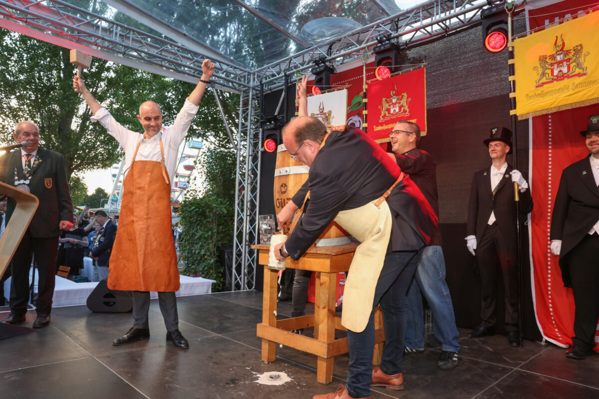Mit nur einem Schlag war das Schützenfest eröffnet: Hannovers Oberbürgermeister Belit Onay hat gestern Abend mit dem traditionellen Fassbier-Anstich das weltgrößte Schützenfest eröffnet. Er benötigte nur einen Schlag mit dem Holzhammer, um den Zapfhahn in das Fass zu schlagen. „Das Bier schmeckt. Das Schützenfest ist eröffnet. Viel Spaß“, wünschte er allen Gästen vor der Bühne. Bis zum ersten Juli-Sonntagabend geht es jetzt auf dem Schützenplatz rund.