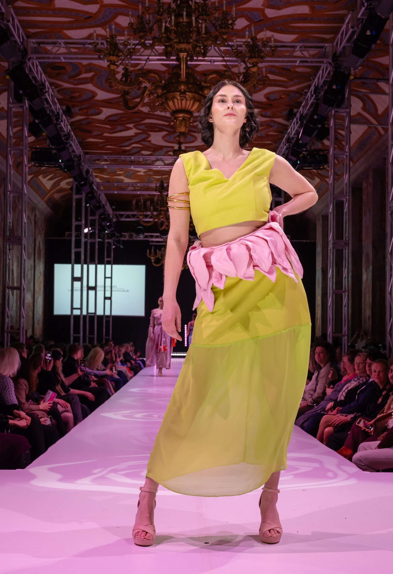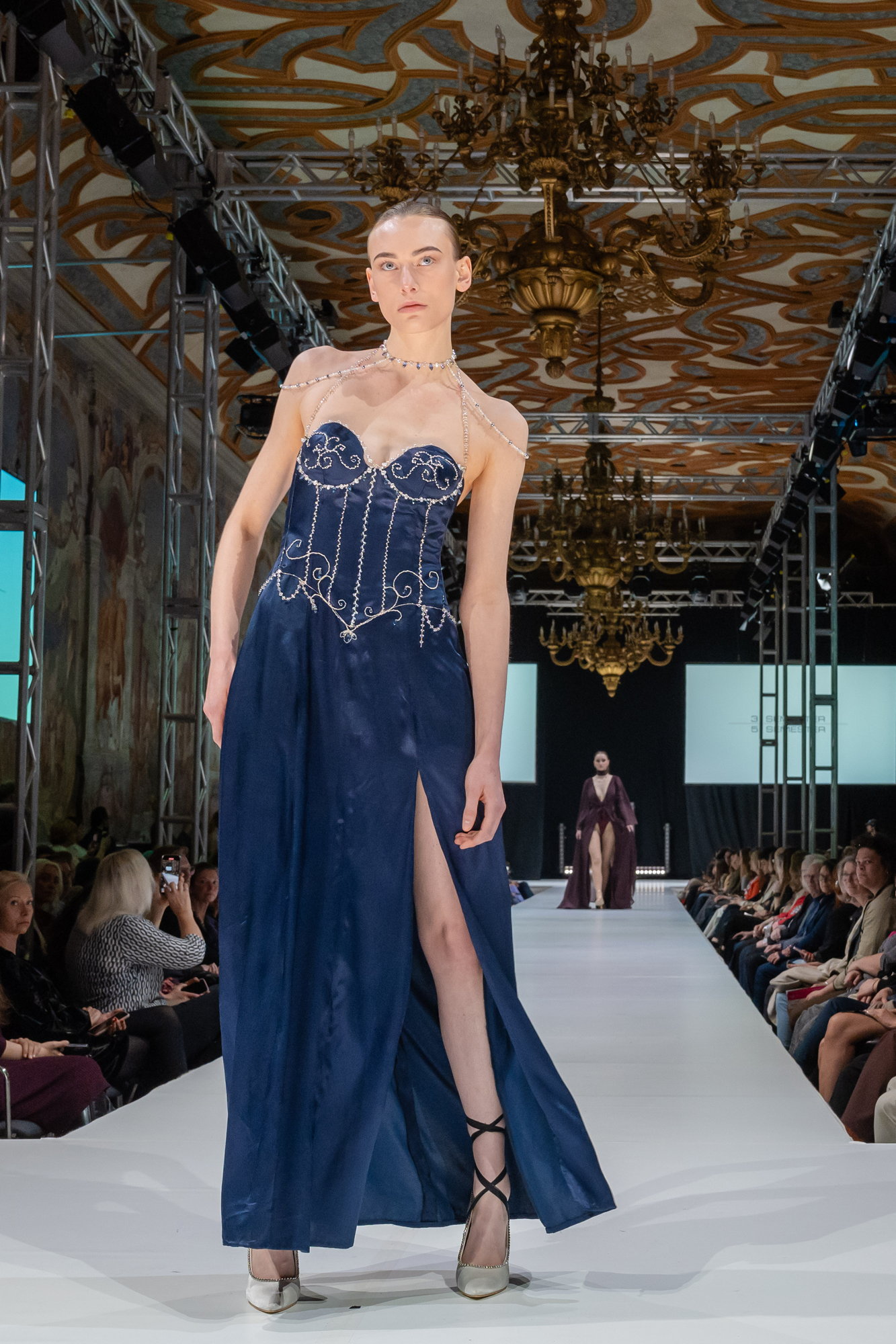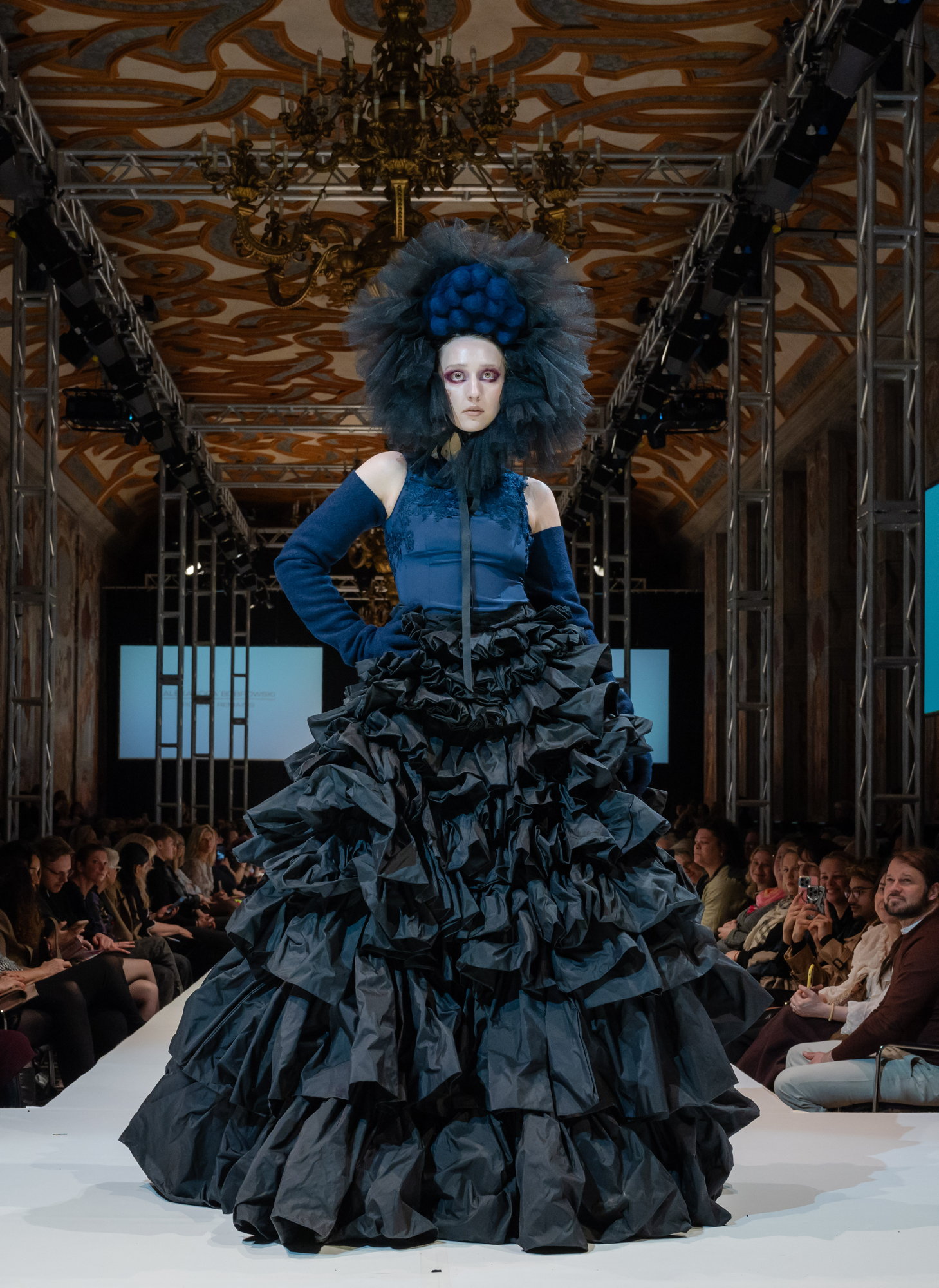 „Lost Acceptance“ nennt sich die Kollektion von Alina Strecker, die sich mit dem Tod beschäftigt. Dementsprechend düster fallen ihre Entwürfe aus. Schwarz und Dunkelgrün dominieren. Die Schnitte sind vom viktorianischen Zeitalter inspiriert. Meriyam Zbib greift mit „Eternal Glory“ die klassische griechische Mythologie auf. Sie fertigt ihre Kleidungsstücke aus Samt und Leder. Korsagen hat sie aus Epoxidharz gefertigt, was den Charakter und die Anlehnung an griechische Skulpturen unterstreicht.