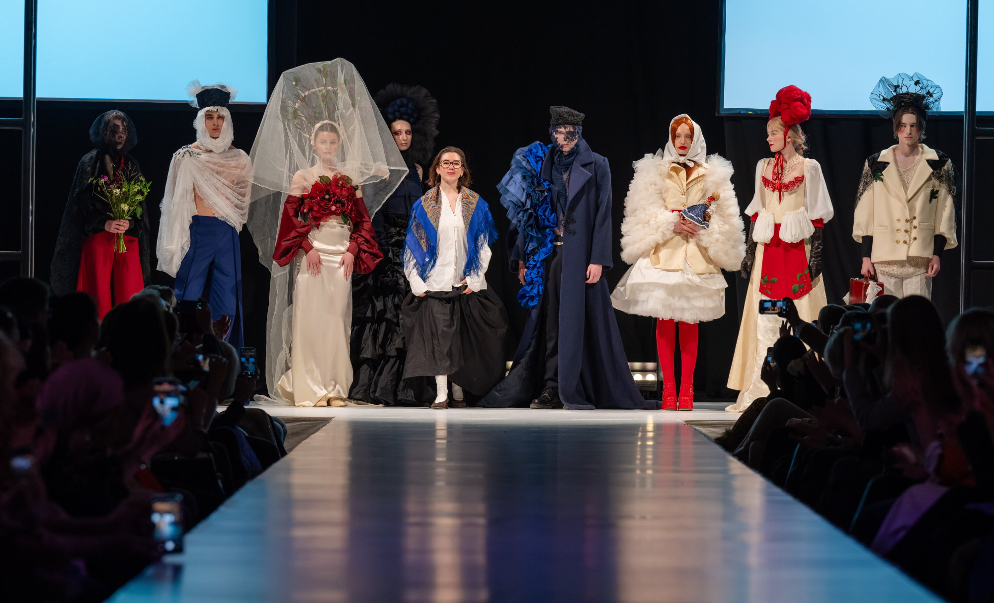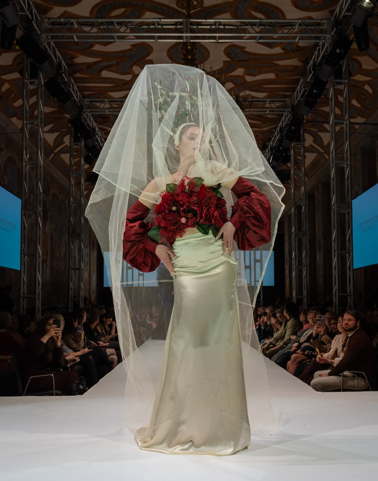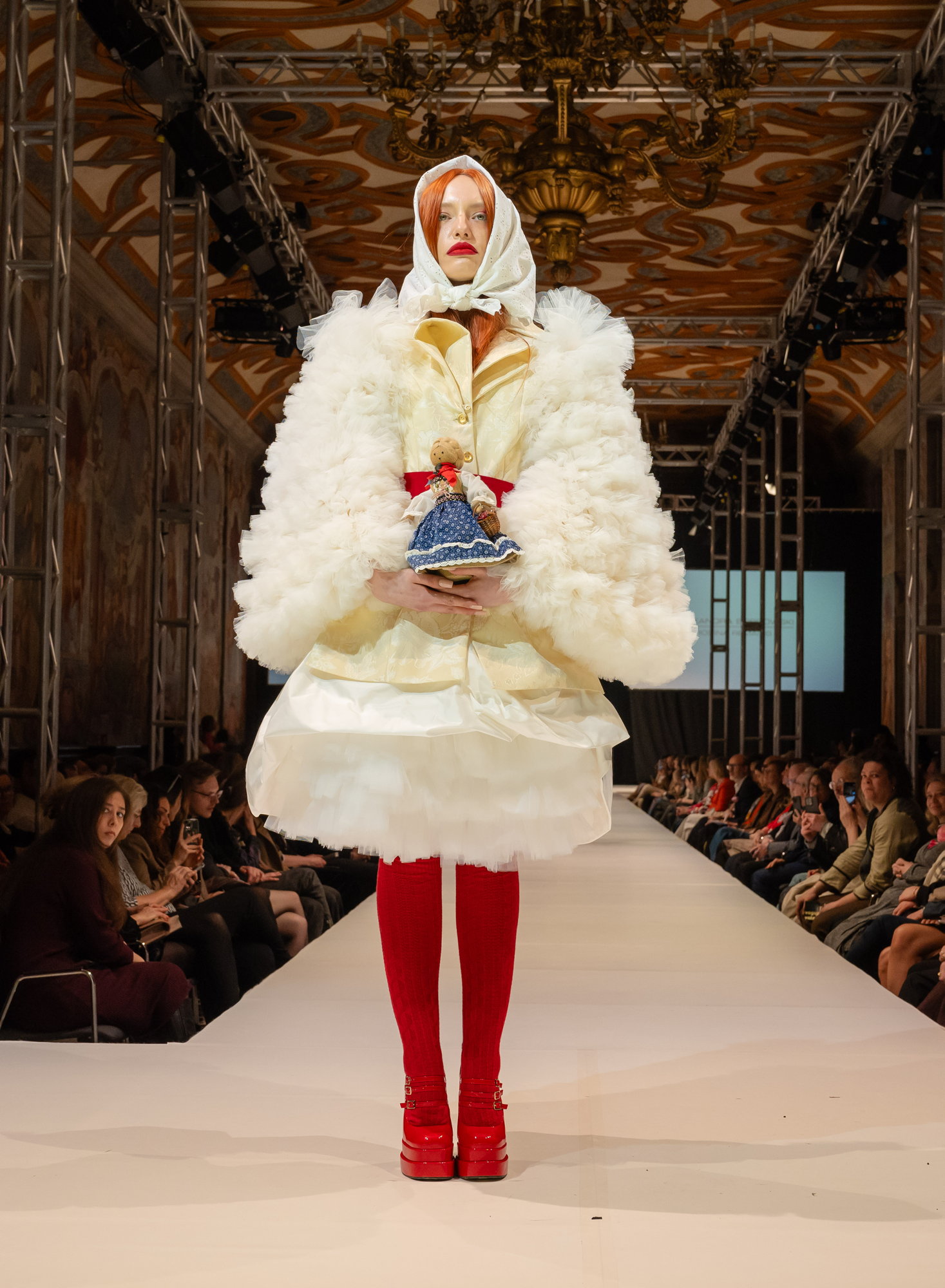 Voluminöse, aufwendig gearbeitete Ärmel an cremeweißen Jacken, schwingende, mehrlagige Tüllröcke und schwarze sowie rote Akzente prägen ihre Arbeit, die aufwendig, luxuriös und edel ist. „Rodina Remains“ ist inspiriert von der russischen und slawischen Tradition und ehrt damit auch eine Kultur, die durch Migration und Wandel geprägt ist.