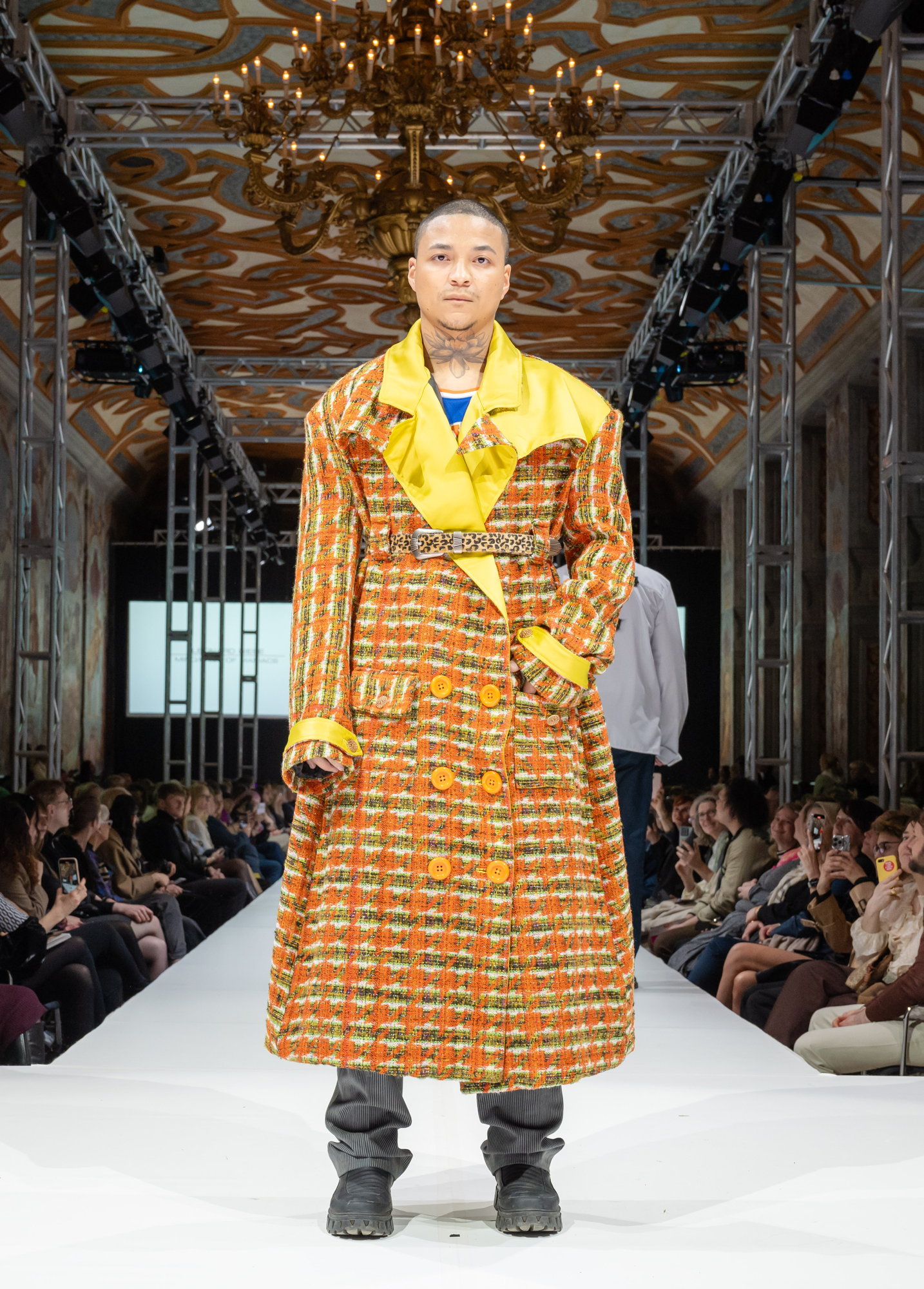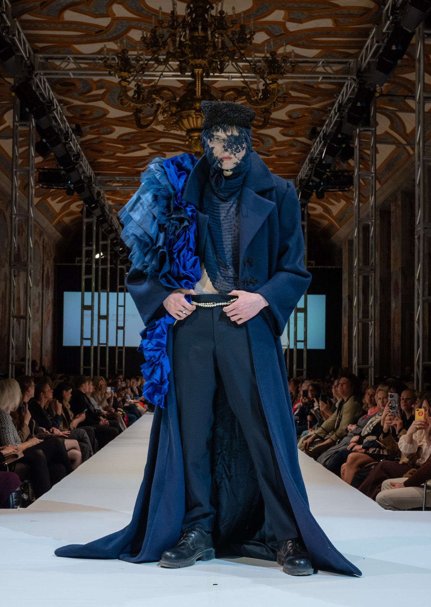 Tom Runge hat sich für seine Kollektion „Threads beneath the Surface“ von Carl Gustav Jung inspirieren lassen. Er setzt auf präzise Schnitte und setzt überraschende Akzente. So gibt es an seinen Hemden nicht nur einen, sondern gleich drei Krägen, ein Anzug wird zur Hose oder zahlreiche Knöpfe schillern auf der Schulterpartie eines Hemdes wie die Schuppen eines Fischs. Seine Kleidungsstücke nehmen Klassiker auf und setzen sie neu wie surrealistische Gemälde zusammen.