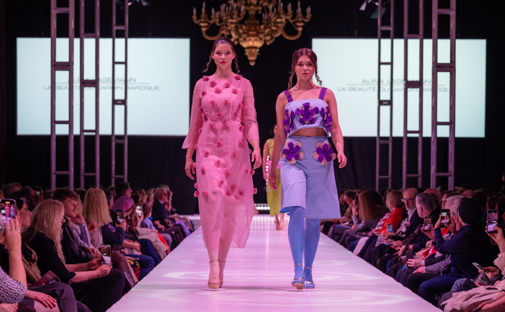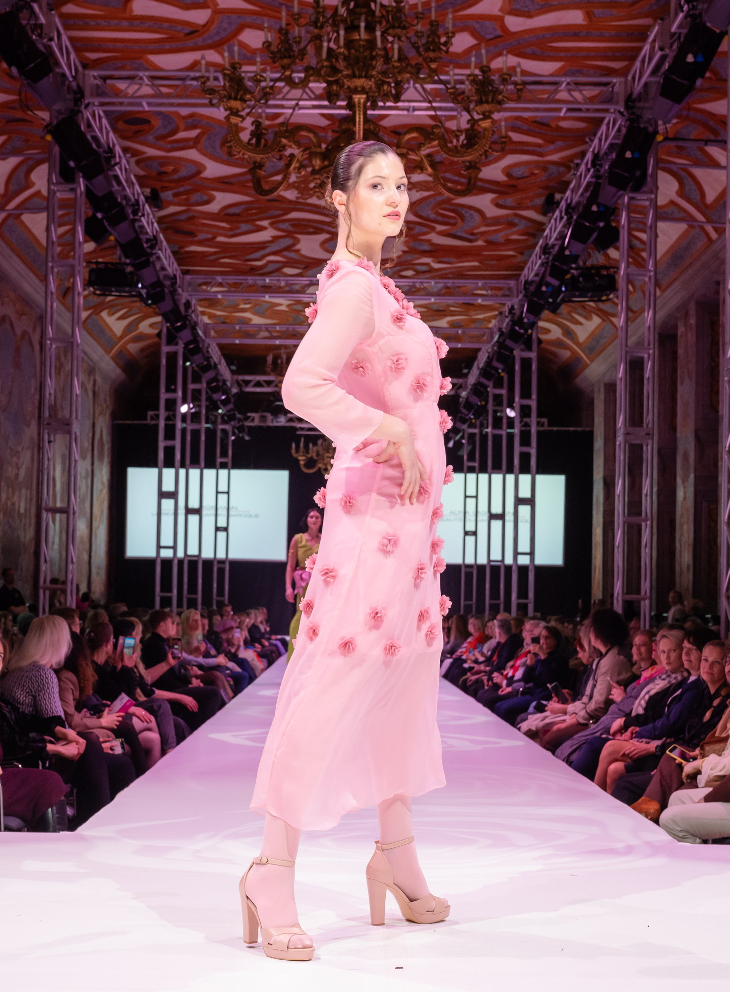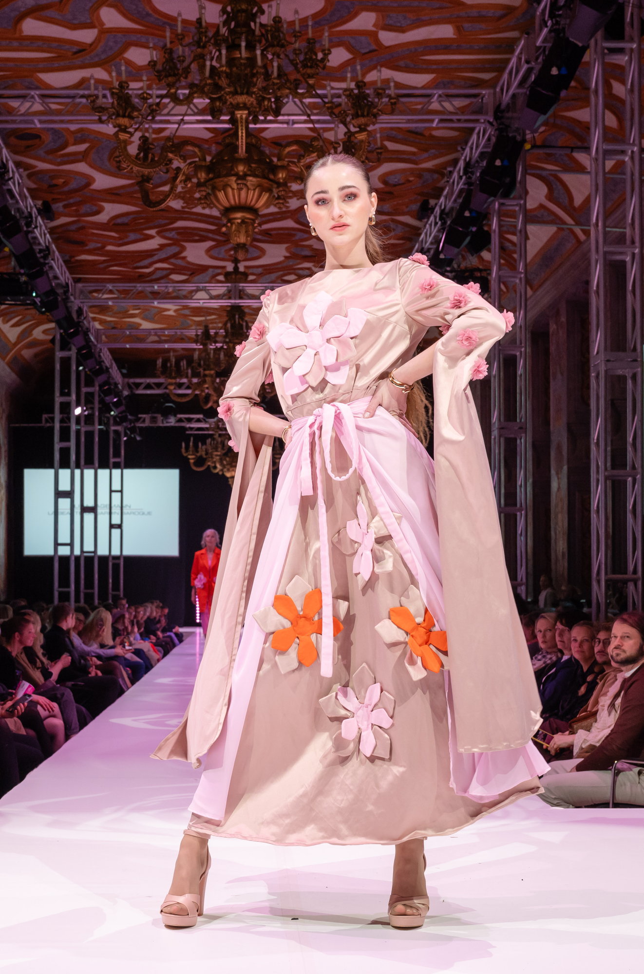 Wie gemacht für das üppig ausgemalte Galeriegebäude in Herrenhausen sind zwei Kollektionen. Zum einen „La beauté du jardin baroque“, was übersetzt „die Schönheit des barocken Gartens“ heißt. Schon mit der Wahl eines französischen Titels für ihre Kollektion weist Alina Lagemann auf eine Tradition im Barock hin: die gängige Sprache an den Höfen war Französisch. Sie hat sich von der Pracht des barocken Gartens inspirieren lassen und zeigt Kleider und Mäntel in sanften Pastellfarben, die mit Blütenblättern oder vollständigen Blumen geschmückt sind.