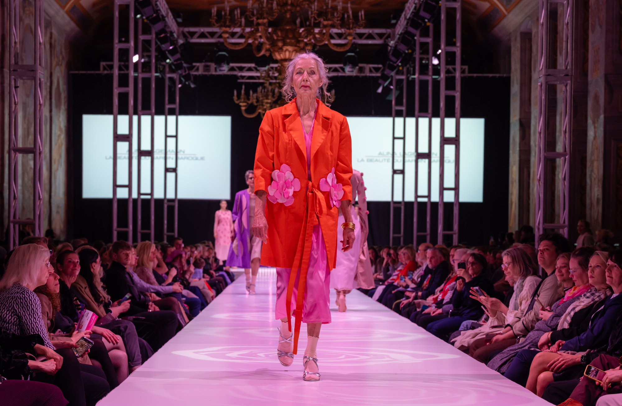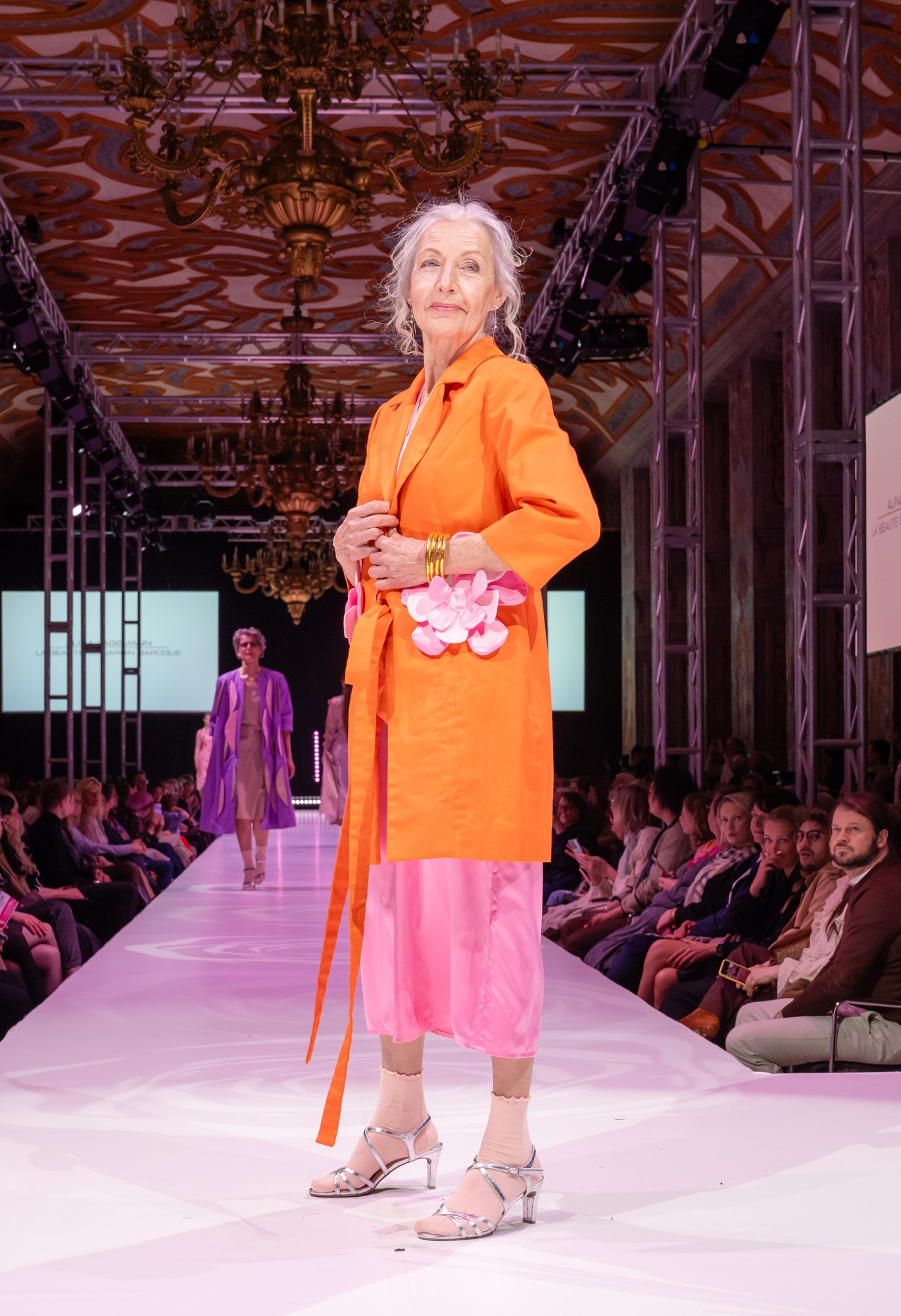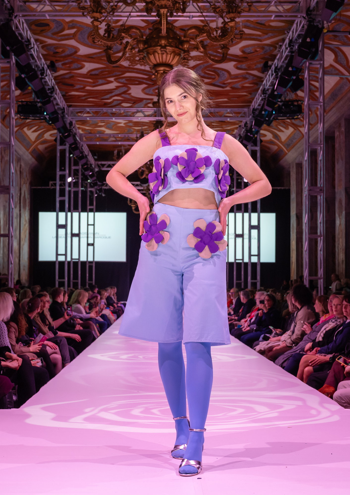 Wie gemacht für das üppig ausgemalte Galeriegebäude in Herrenhausen sind zwei Kollektionen. Zum einen „La beauté du jardin baroque“, was übersetzt „die Schönheit des barocken Gartens“ heißt. Schon mit der Wahl eines französischen Titels für ihre Kollektion weist Alina Lagemann auf eine Tradition im Barock hin: die gängige Sprache an den Höfen war Französisch. Sie hat sich von der Pracht des barocken Gartens inspirieren lassen und zeigt Kleider und Mäntel in sanften Pastellfarben, die mit Blütenblättern oder vollständigen Blumen geschmückt sind.