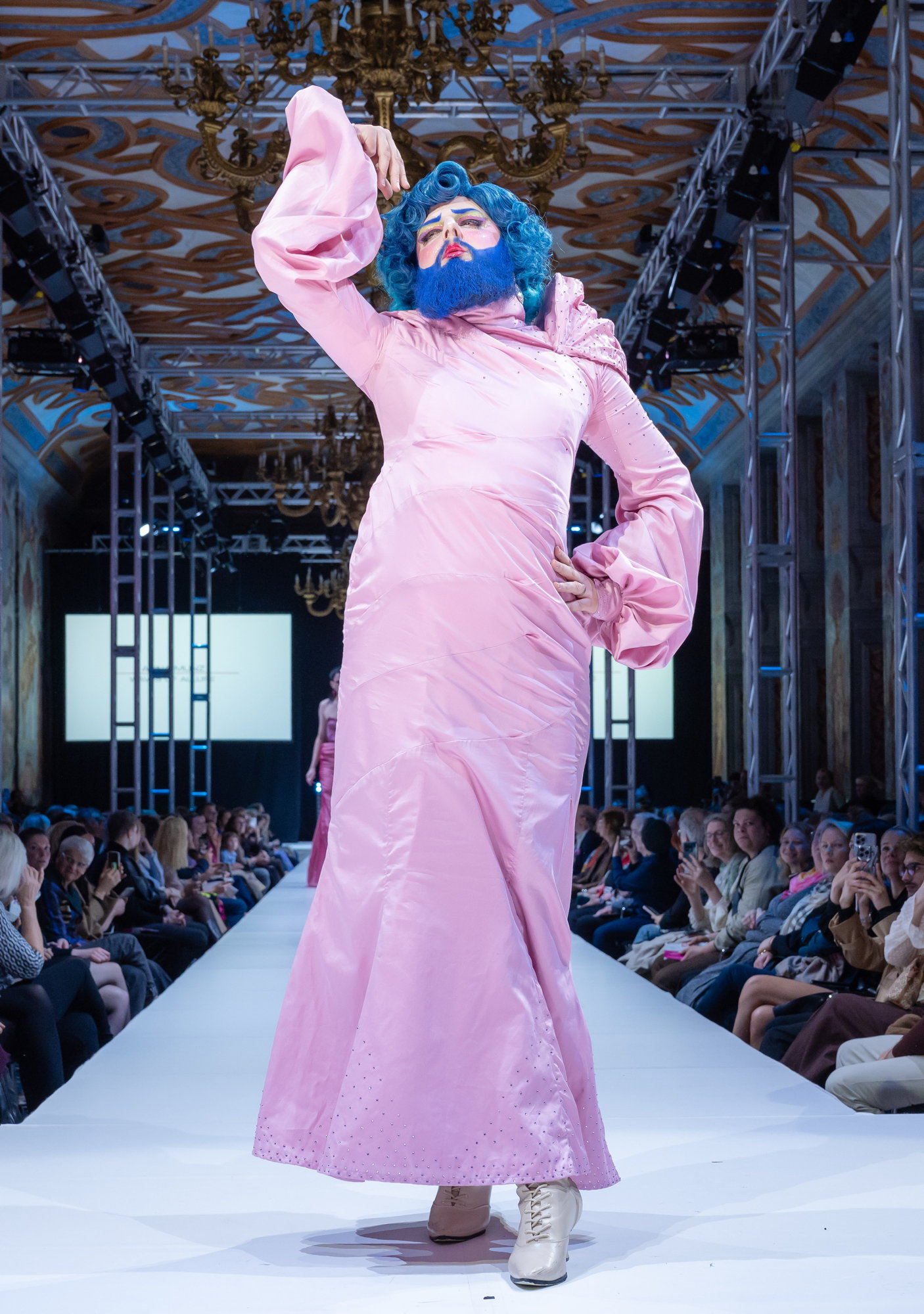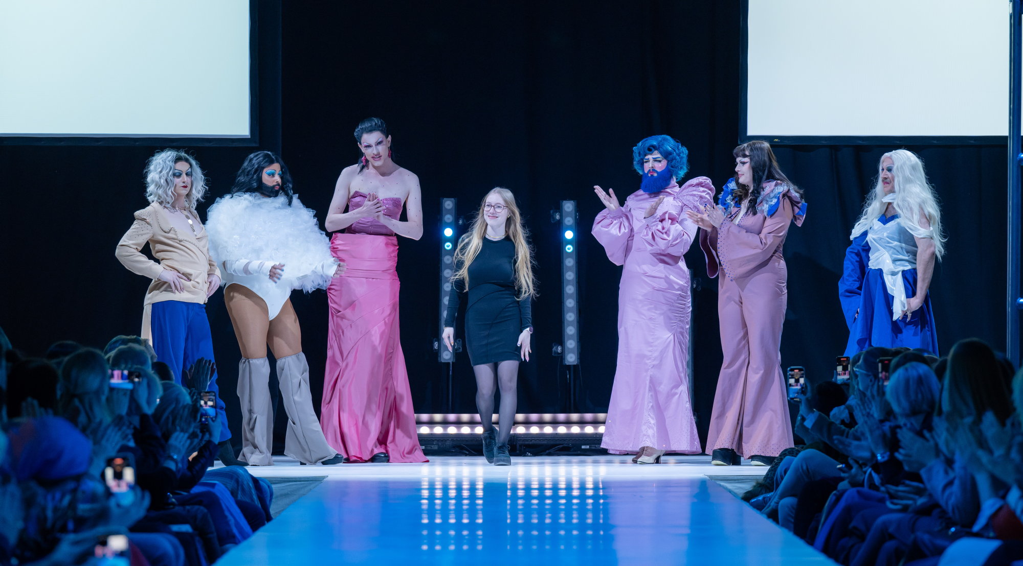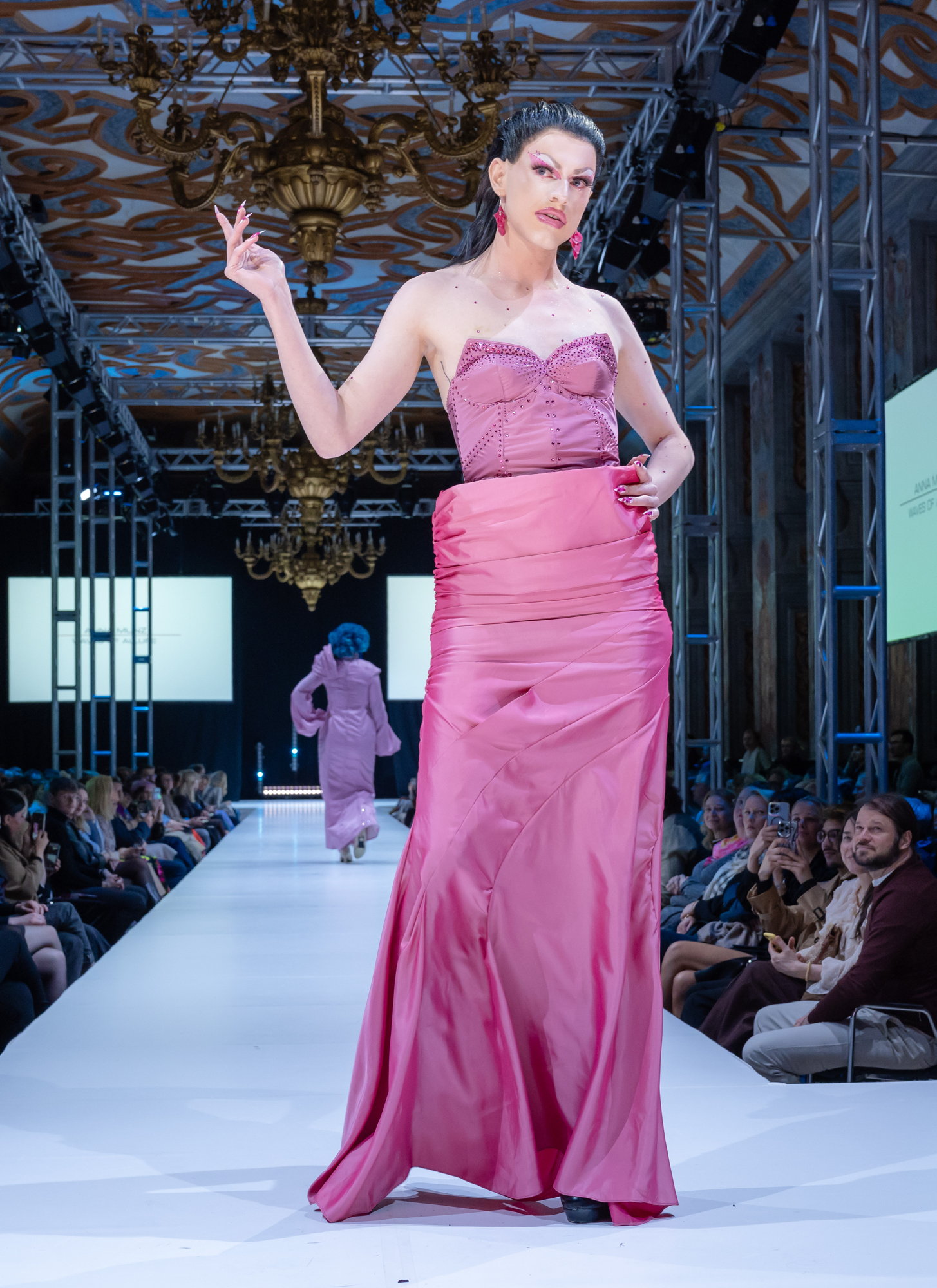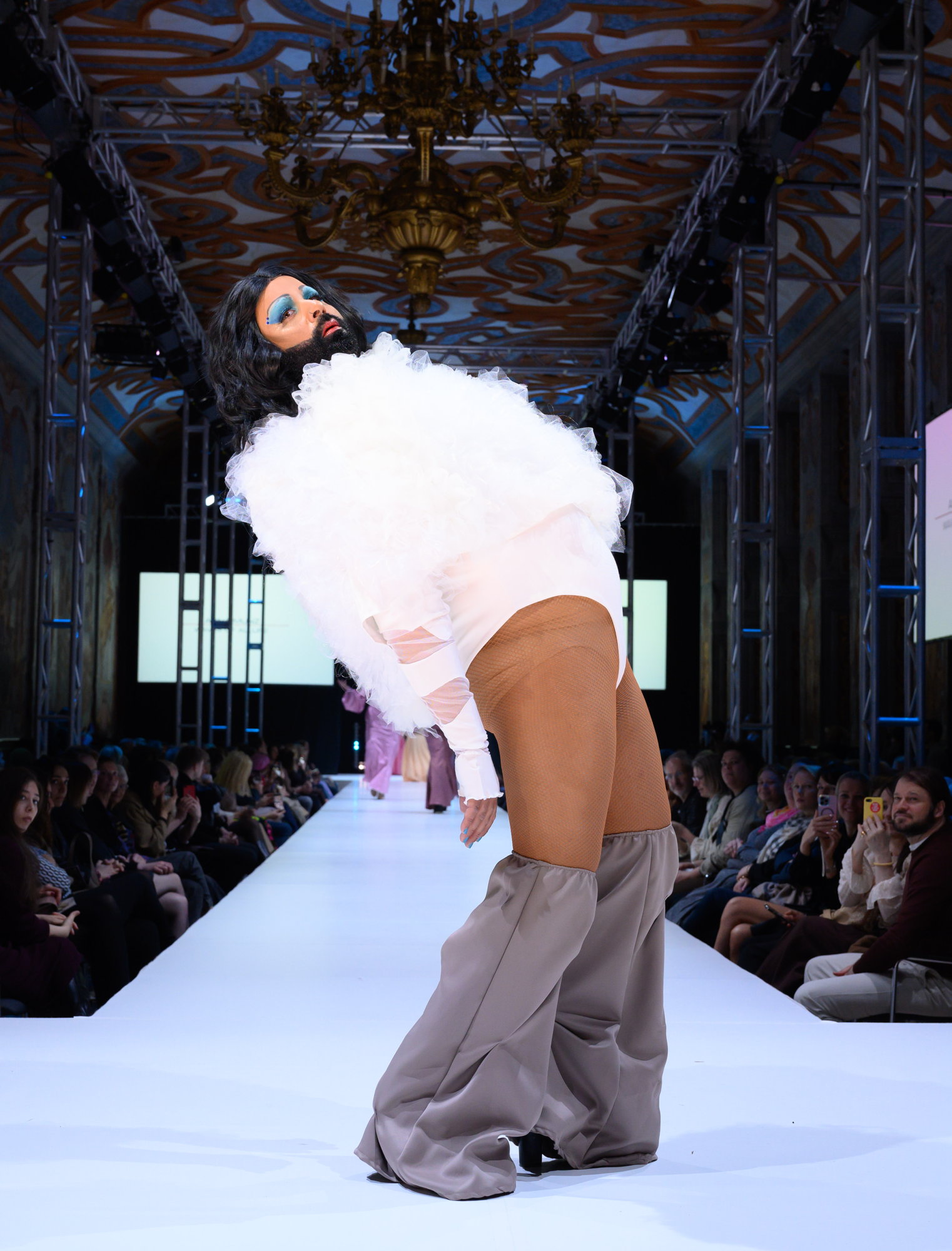 Noch einen Schritt weiter geht Anna Munz mit „Waves of Allure“. Ihre Drag-Kollektion ist geprägt von körperbetonten Schnitten wie man sie von klassischen Abendkleidern kennt. Korsagen, enge, trompetenförmige Röcke, weite High-Low-Abendröcke, die sich beim Gehen divenhaft aufblähen – ihre Models sind die Drag-Queens des Abends.