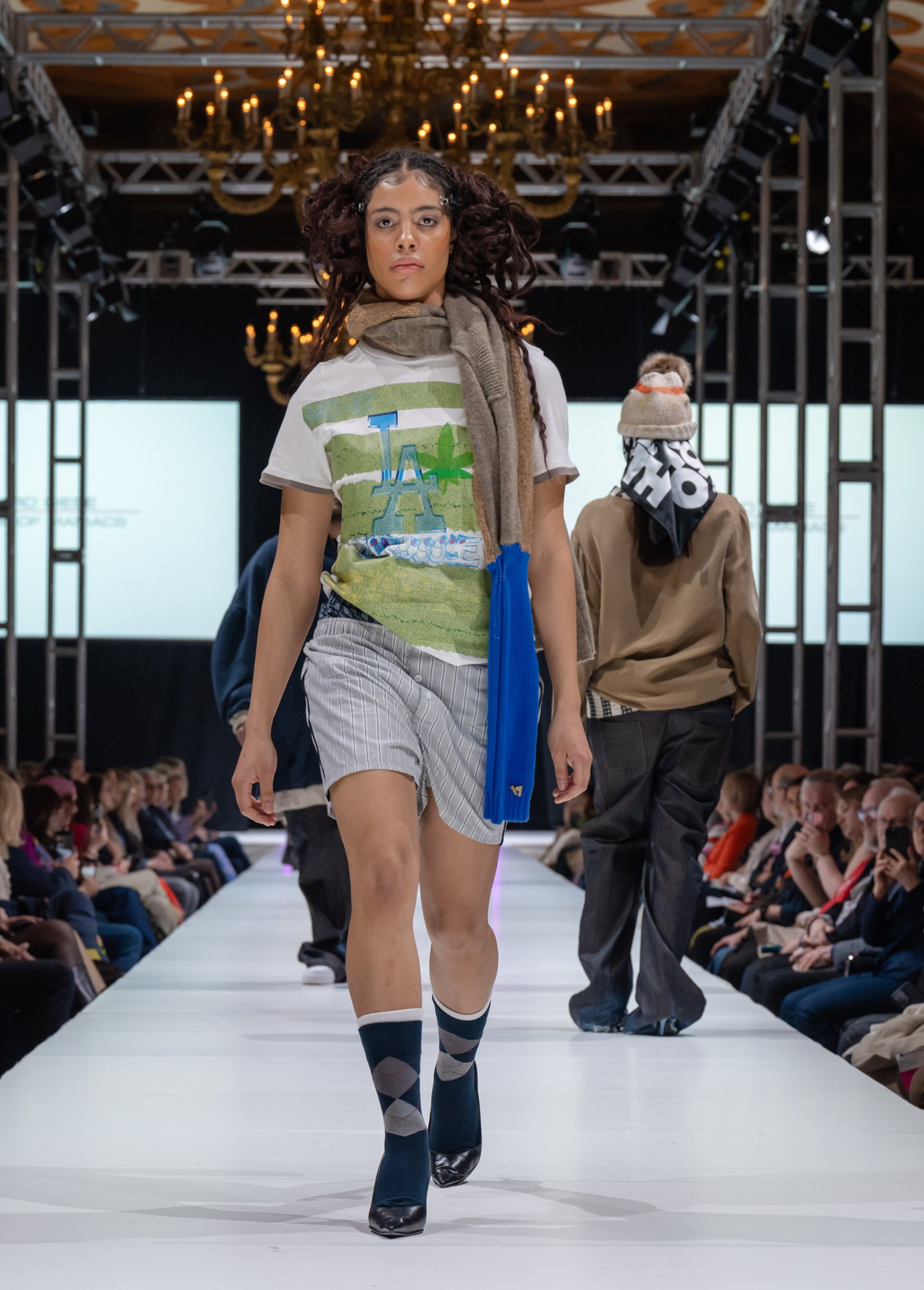 Ganz und gar nicht zart ist die Kollektion von Leonard Giese „Mind/Raise of Maniacs“. Sie ist geprägt von der Hip-Hopp-Kultur. Sein Streestyle ist immer oversize. Manchmal lässt er seine Models quasi in den Sachen verschwinden, manchmal sind Graffitis wie mahnende Demo-Plakate auf Shirts und Kleider gesprüht.