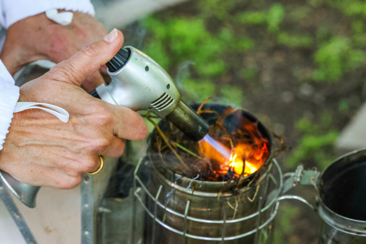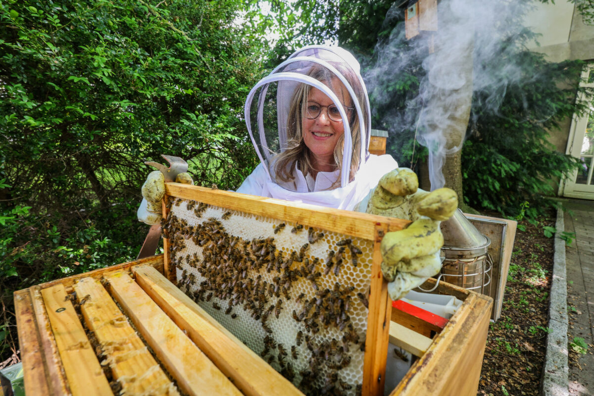 Wiebke Langefeld setzt sich ihren Imkerhut auf und zieht den hellen Schutzanzug an. Sie bläst mit dem Smoker etwas Rauch in den Stock, das beruhigt die Bienen. So kann Langefeld die Waben untersuchen, hat einen besseren Blick und wird auch nicht gestochen. Die geschwärmten Bienen bauen ihre Waben selbst. Langefeld hat hier keine vorgefertigten Bienenwachsplatten eingehängt. „Es ist doch faszinierend, wie perfekt sie es hinkriegen, ohne vorgegebene Struktur“, sagt sie.