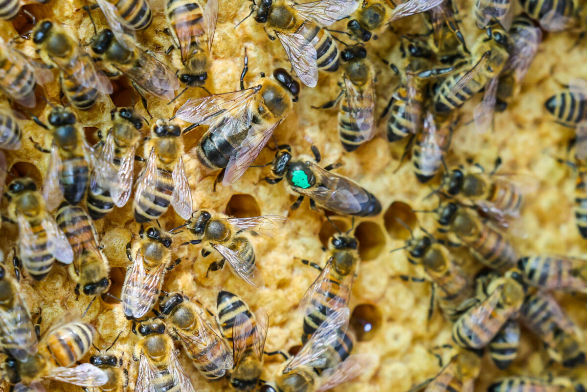 mit einem grünen Punkt markiert, ausgeflogen für ihren Hochzeitsflug. „Sie tut dies am liebsten bei 25 Grad gegen 15 Uhr“, erklärt Langefeld und muss schmunzeln über die exakte Taktung der Bienen.