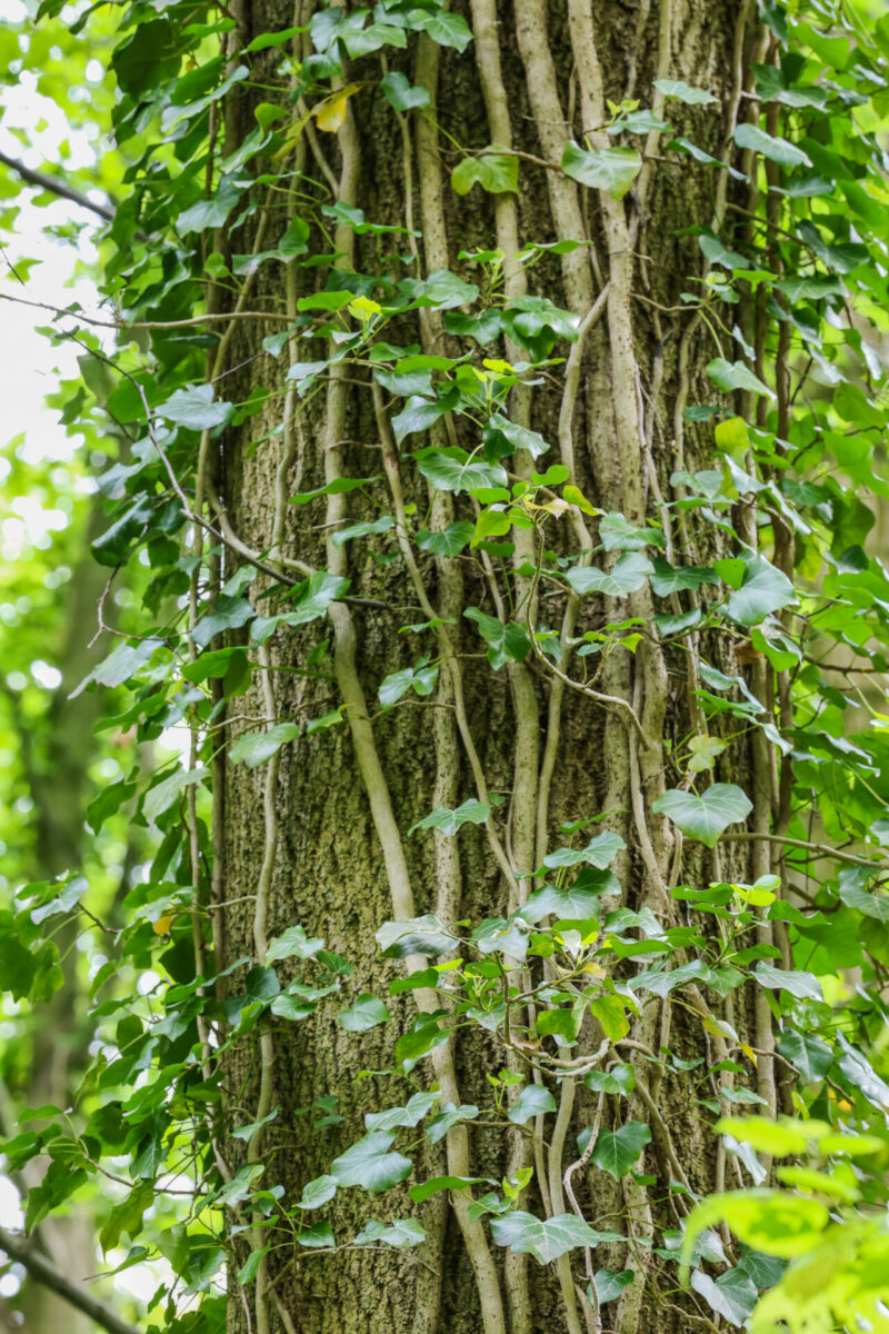 Viele Bäume sind von Efeu bewachsen. Dieser wächst ausschließlich gerade die Stämme hinauf. „Das ist sehr wichtig. Nur wenn er gerade wächst, ist er auch eine Art Schutz für den Baum, sonst würde er ihn würgen und das wäre nicht gut für ihn“, erklärt die Waldführerin. Der Efeu sei generell sehr wichtig. „Weil er im Herbst blüht und ab Januar Früchte trägt, ist er das erste Vogelfutter im Jahr.“