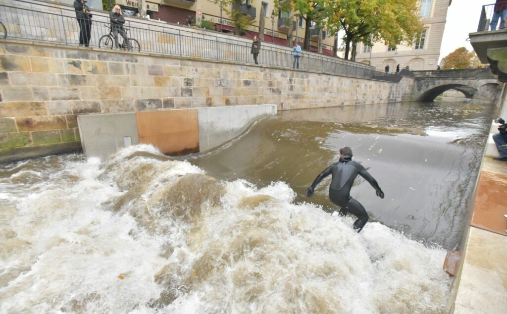 Dafür sorgt seit August 2022 eine im Flussbett der Leine installierte technische Anlage. Mithilfe von drei stufenlos hydraulisch regulierbaren Wellenkörpern aus Stahl – jeder drei Meter breit und fünf Meter lang – erzeugt diese nach Wunsch hier eine steilere oder flachere stehende Welle, um auf dieser Wellenreiten zu können.
