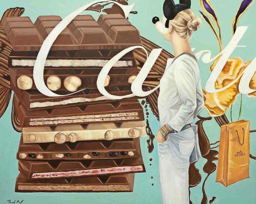 Anders als früher Andy Warhol belässt es Meyer nicht dabei, Suppendosen, Colaflaschen oder Starschauspielerinnen im Serienbild zu zeigen. Vielmehr gehen die einzelnen Elemente bei ihm eine sonderbare Verbindung ein – dann kippen Perspektiven und Blickwinkel, typographische Einsprengsel können auftauchen, ein Bildausschnitt wirkt wie ein abgerissenes Foto, eine dickflüssige Struktur changiert zwischen Farbe und Schokolade. Oder eine Figur, die dem Kosmos des französischen Klassizisten Jacques-Louis David entnommen ist, trägt plötzlich den Kopf von Rihanna.